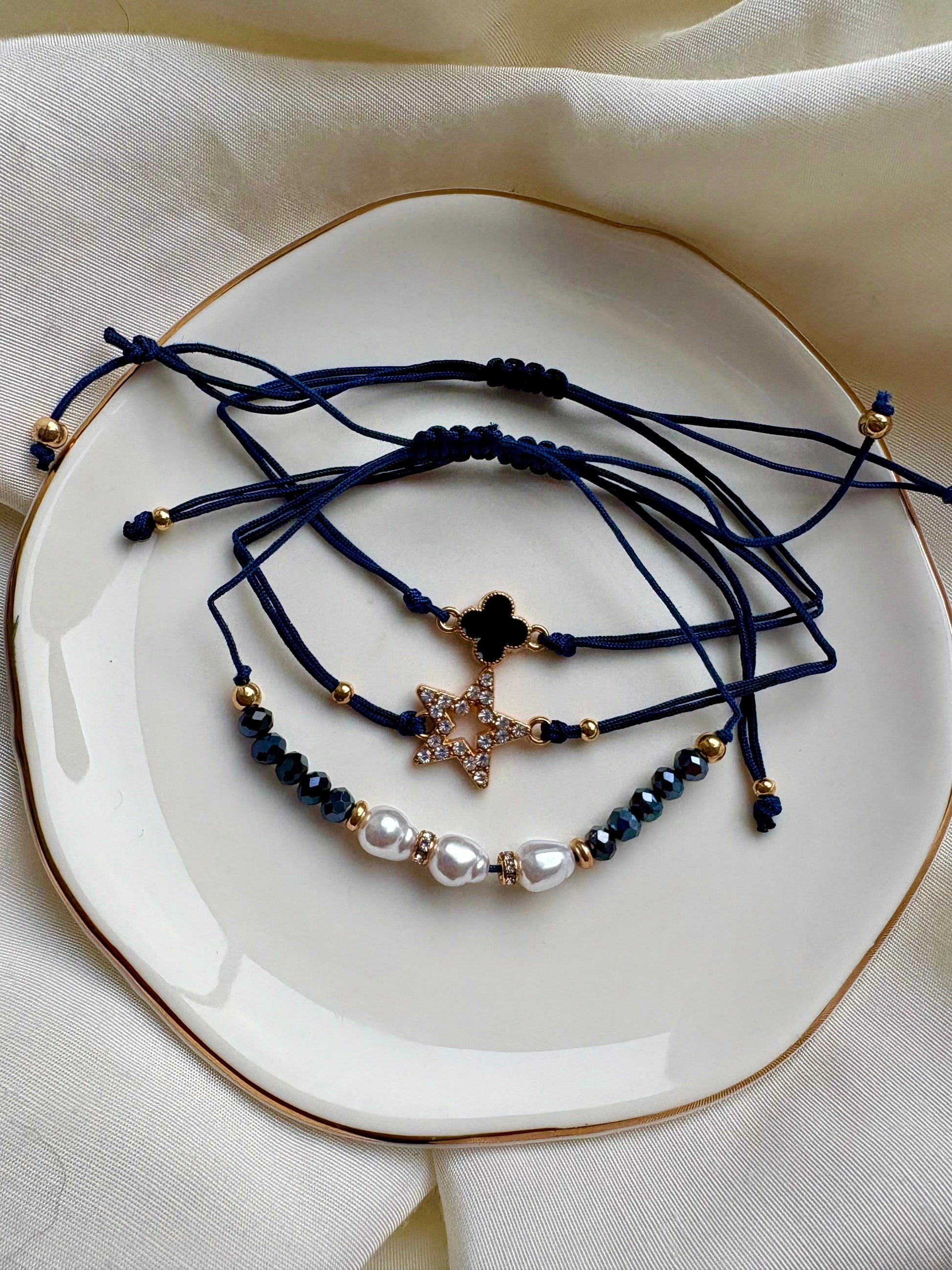 Drei zauberhafte Armbänder in strahlendem Blau – dein perfektes Set! Das erste besticht mit einem eleganten Stern-Anhänger, das zweite mit einem niedlichen Kleeblatt und das dritte mit glänzenden Perlen.