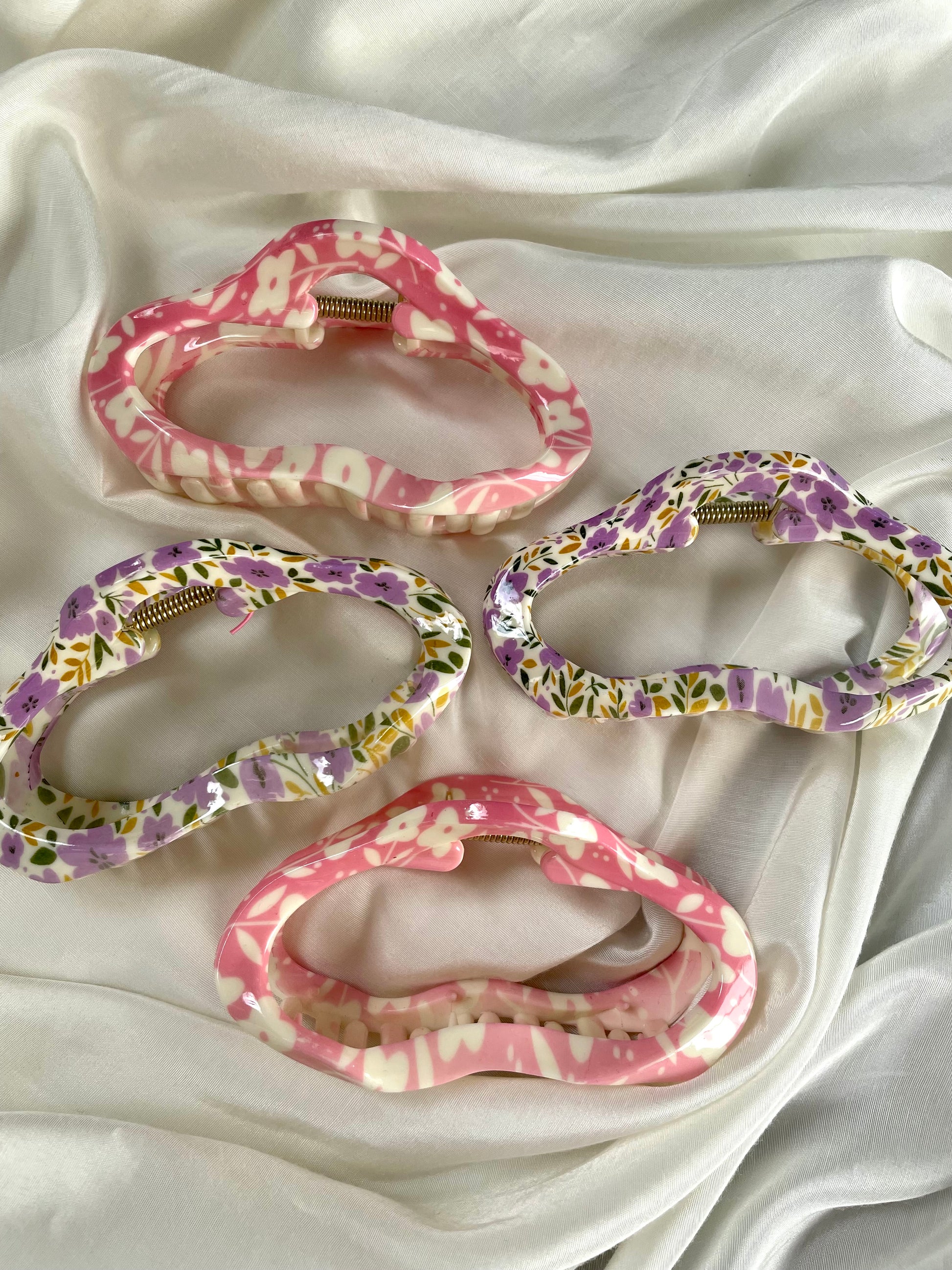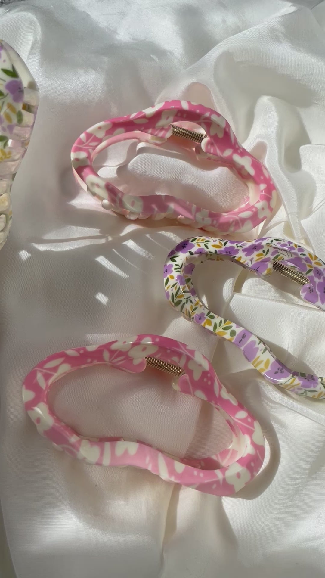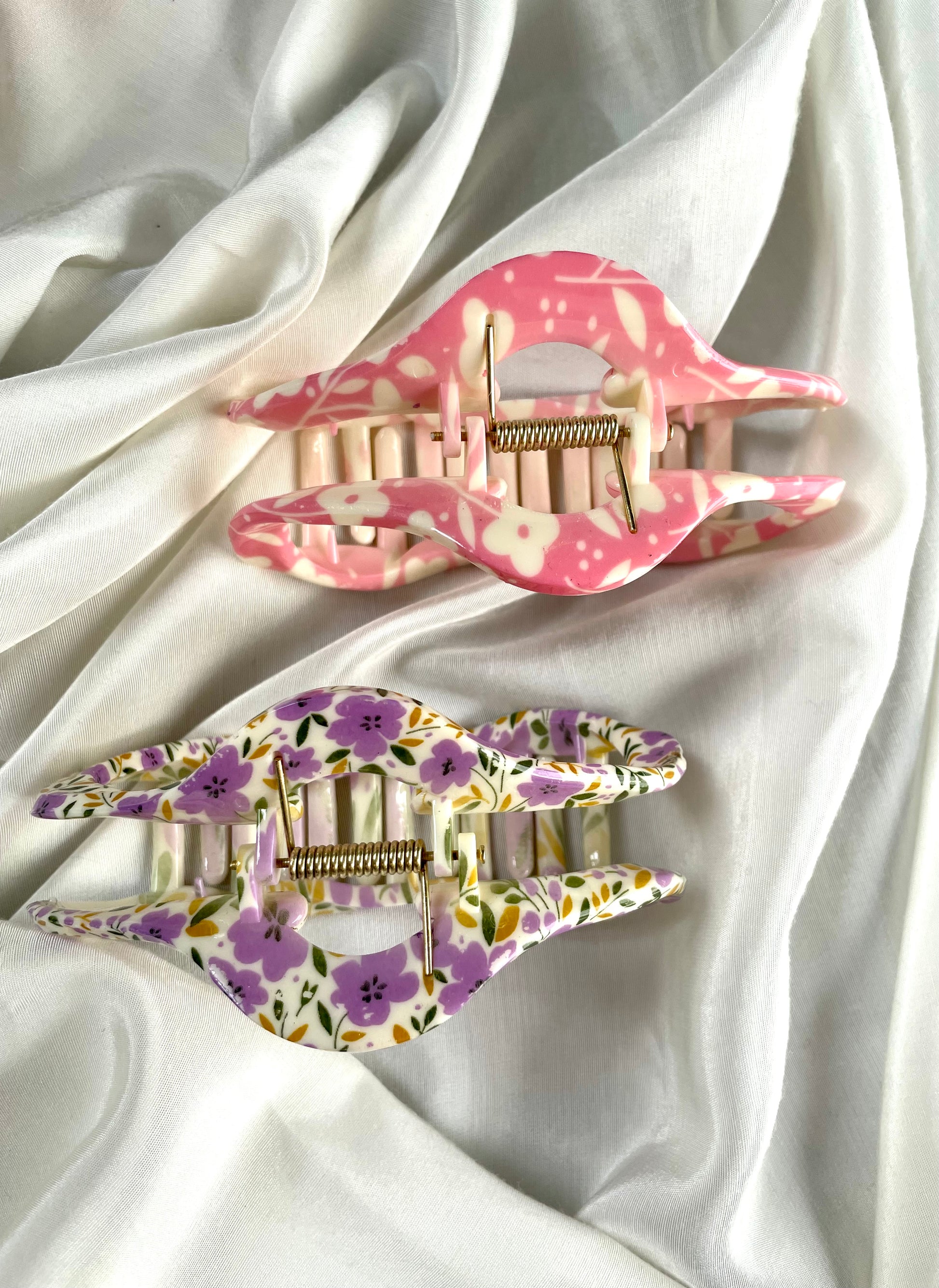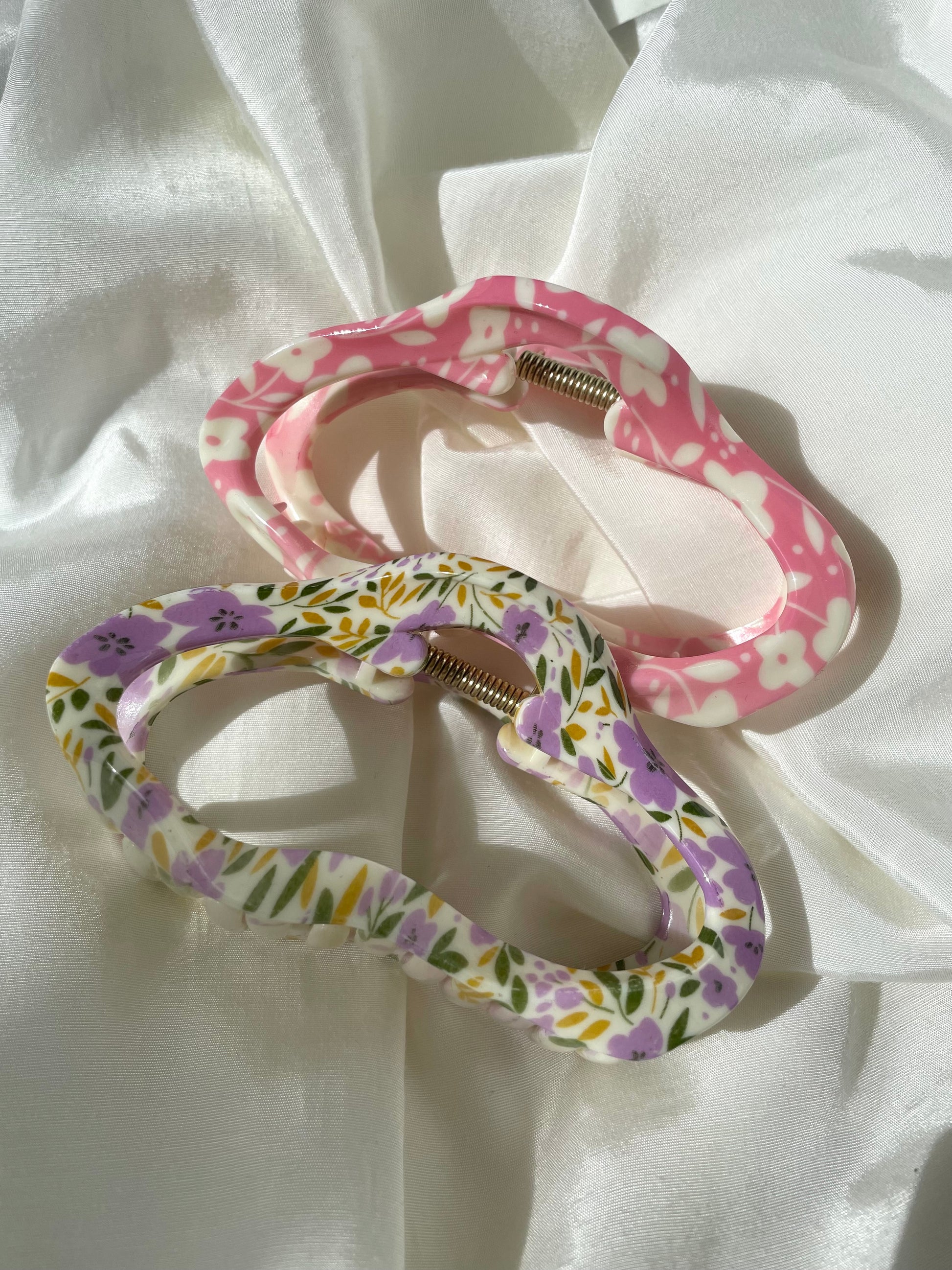 Hier seht ihr zwei verschiedene Haarspangen in Blumen Muster.