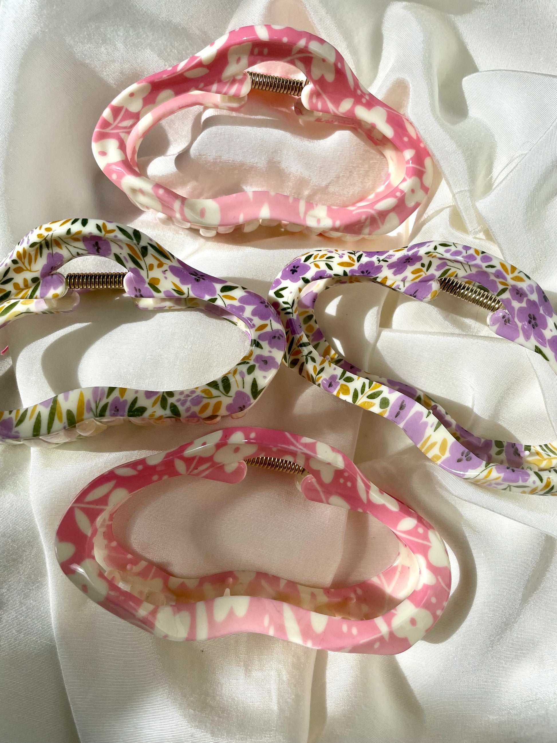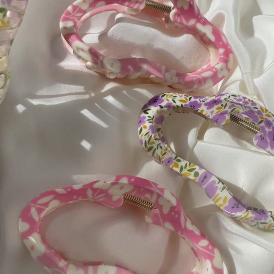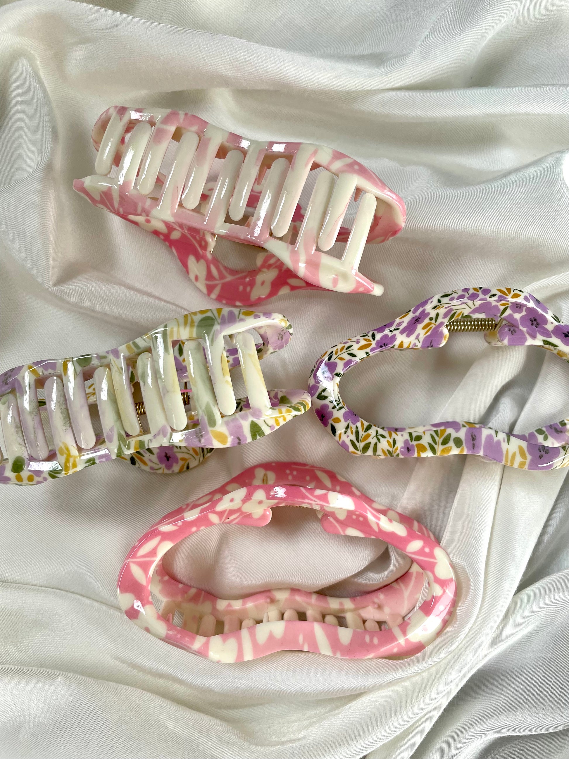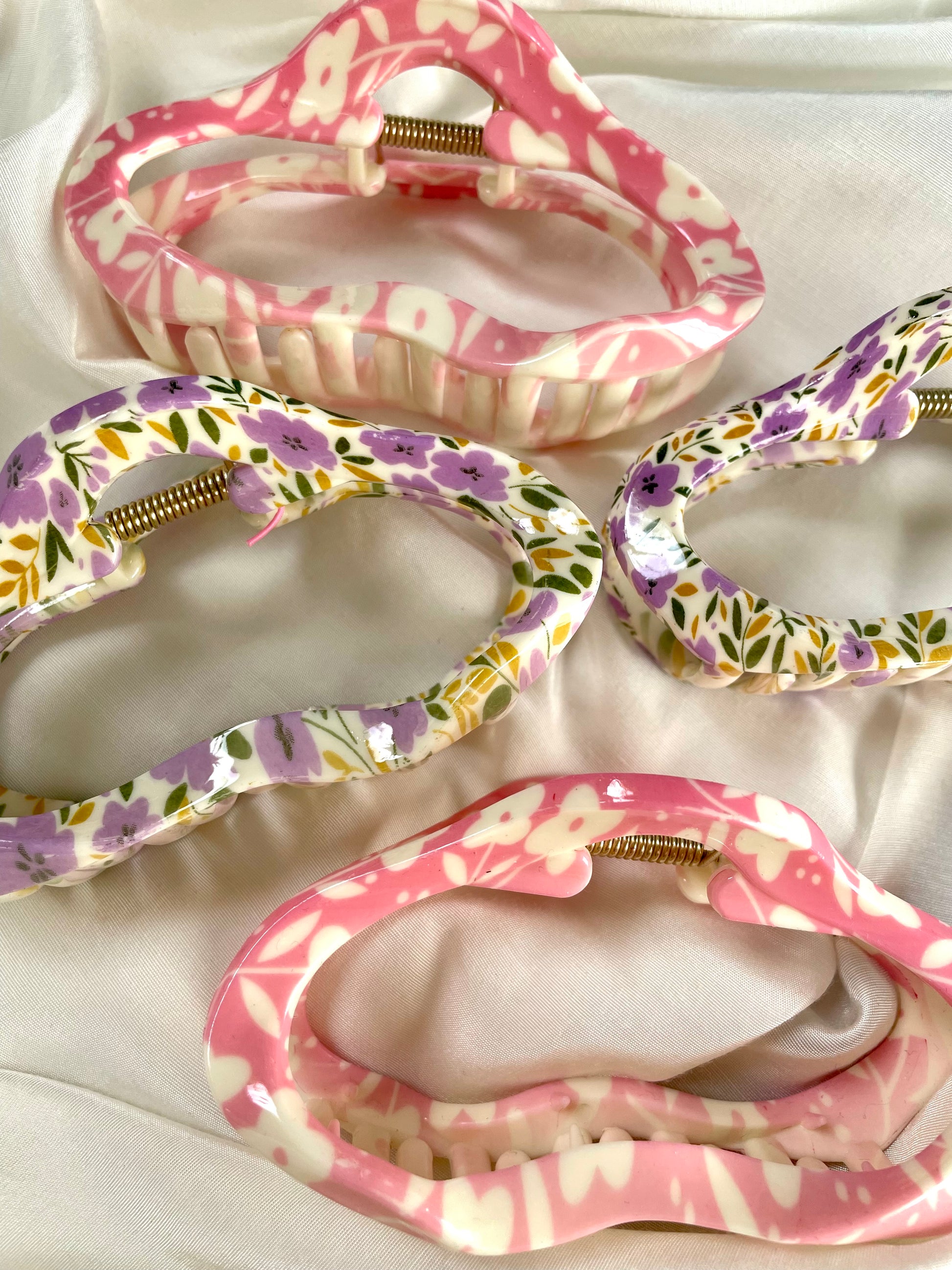 Hier seht ihr zwei verschiedene Haarspangen in Blumen Muster.