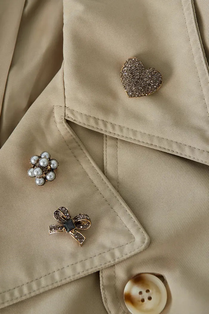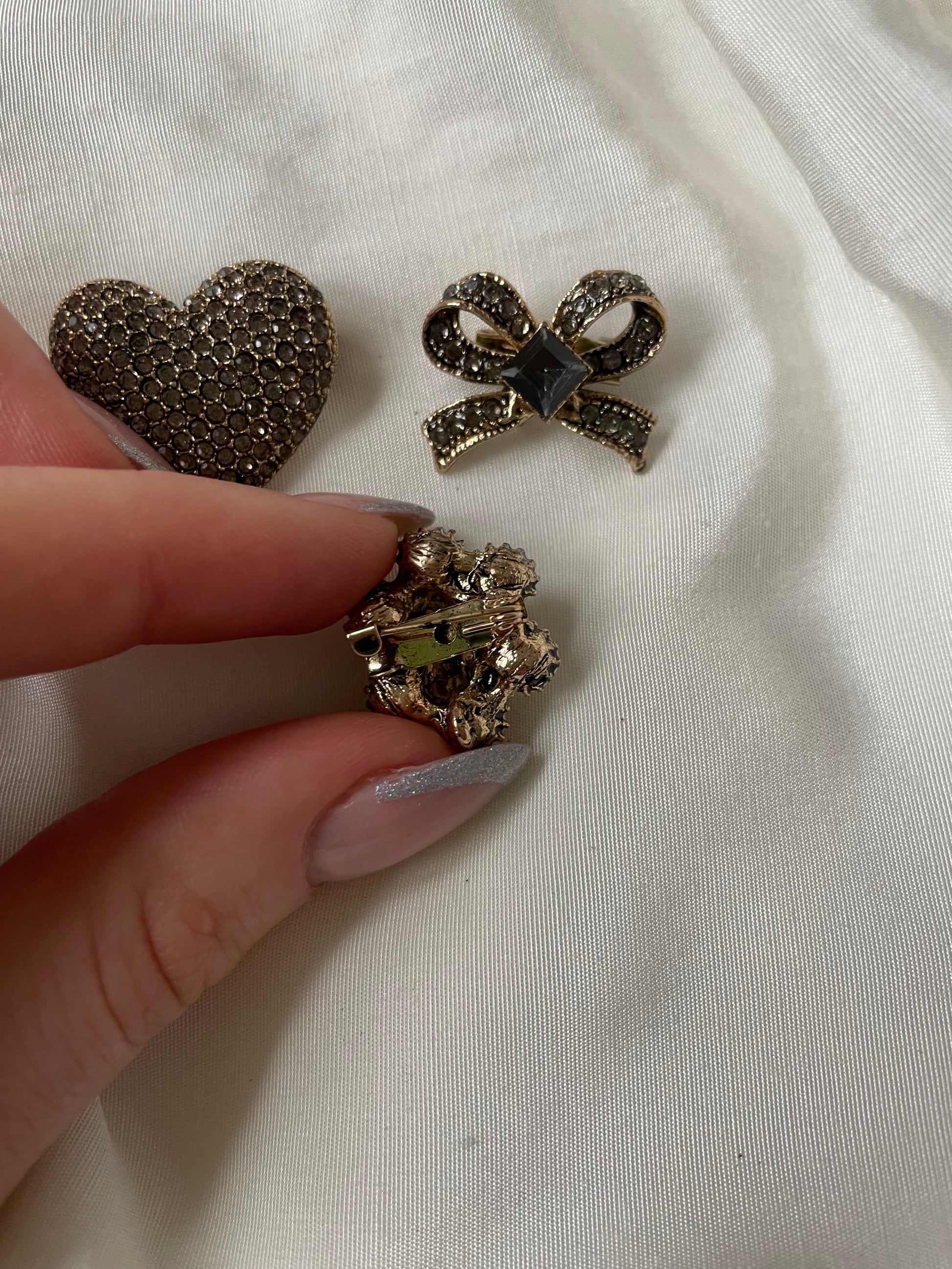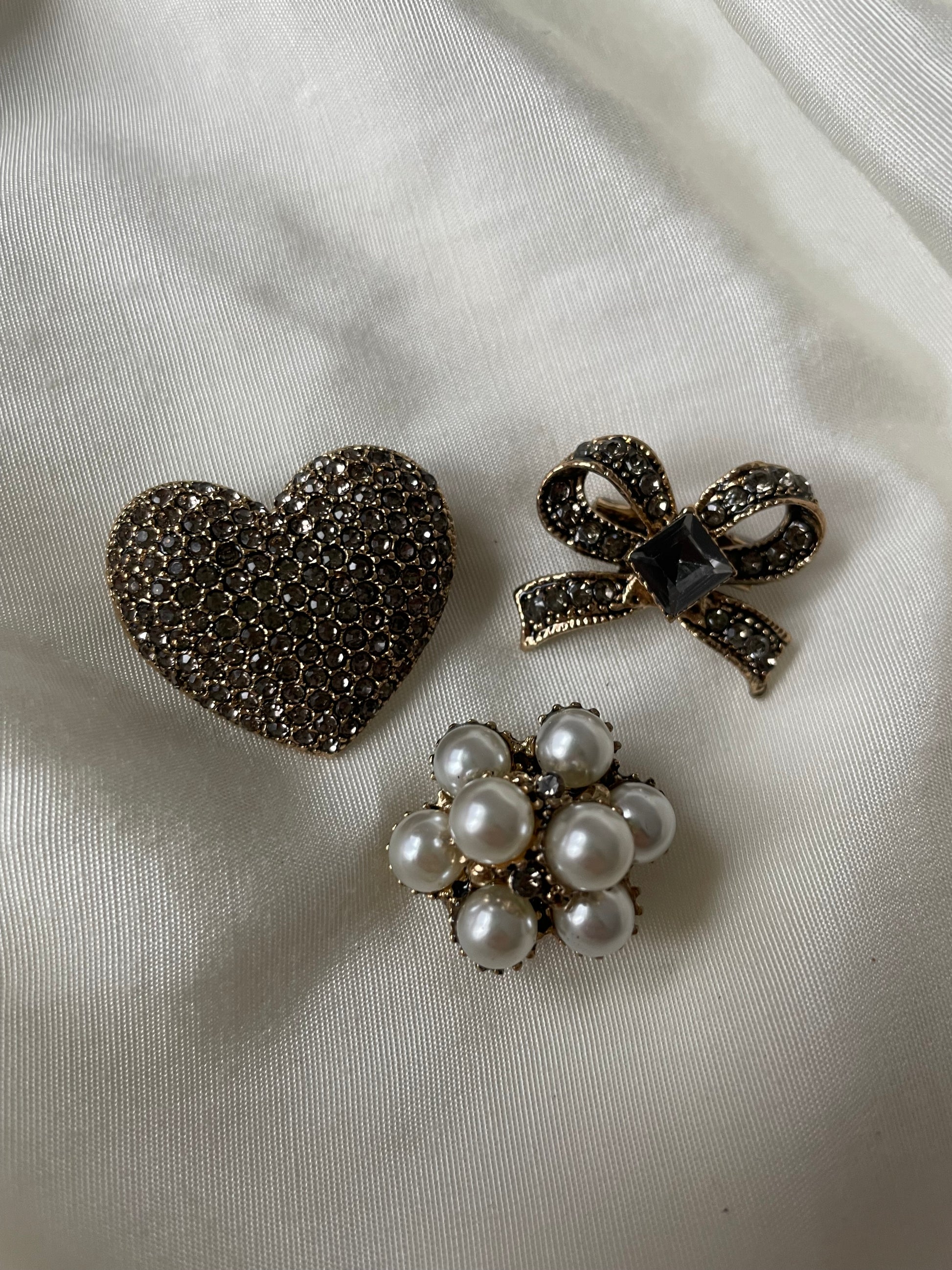Hier siehst du das wunderschönen Broschen Trio "Schleife". Das Set beinhaltet drei Broschen: eine Schleife, eine Perlenbrosche und einem Herz.