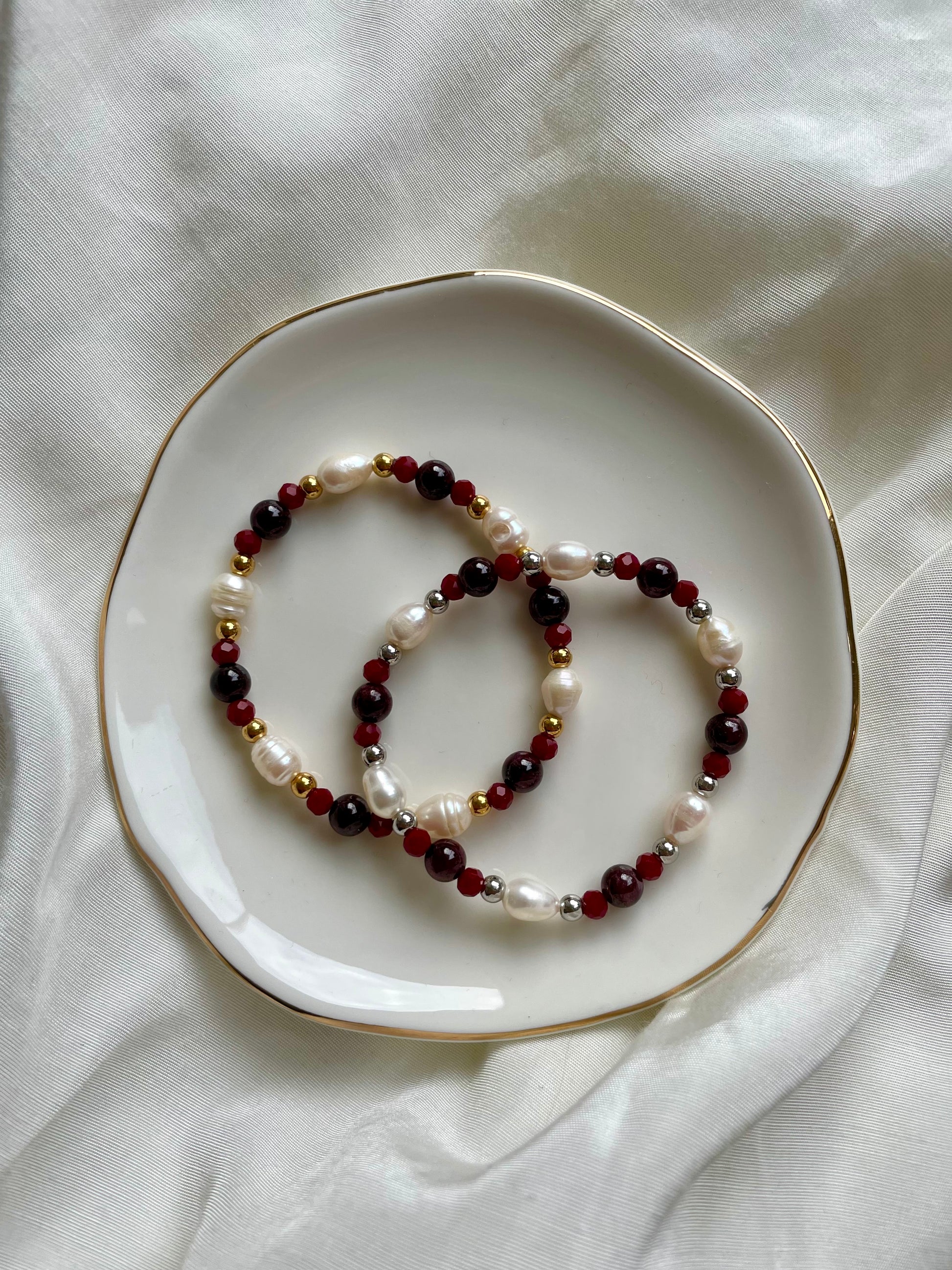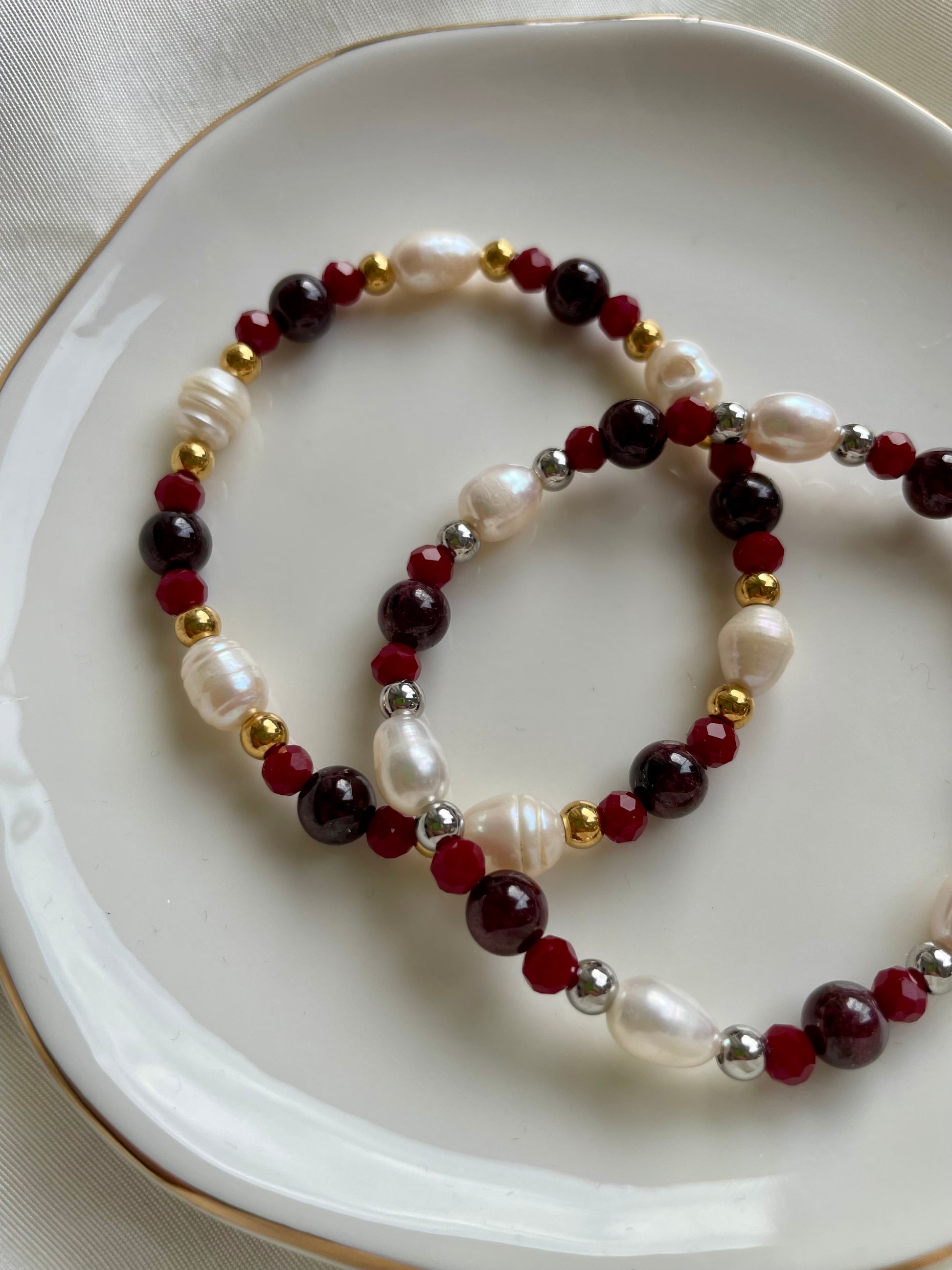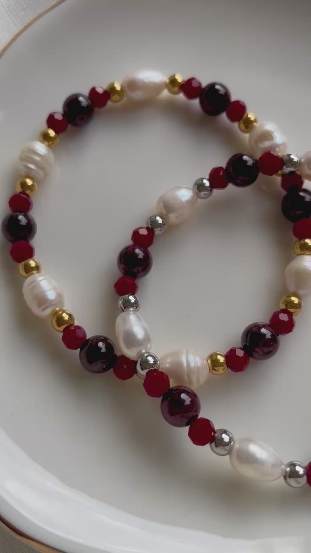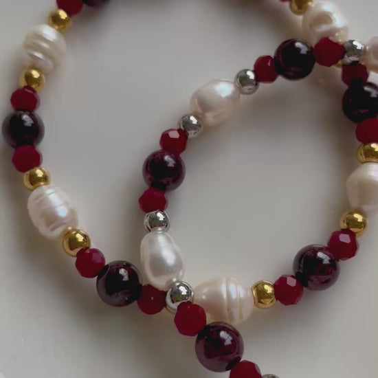 Hier siehst du das wunderschöne Christmas Süßwasserperlen-Armband mit goldenen Perlen, Edelsteinperlen und Süßwasserperlen.