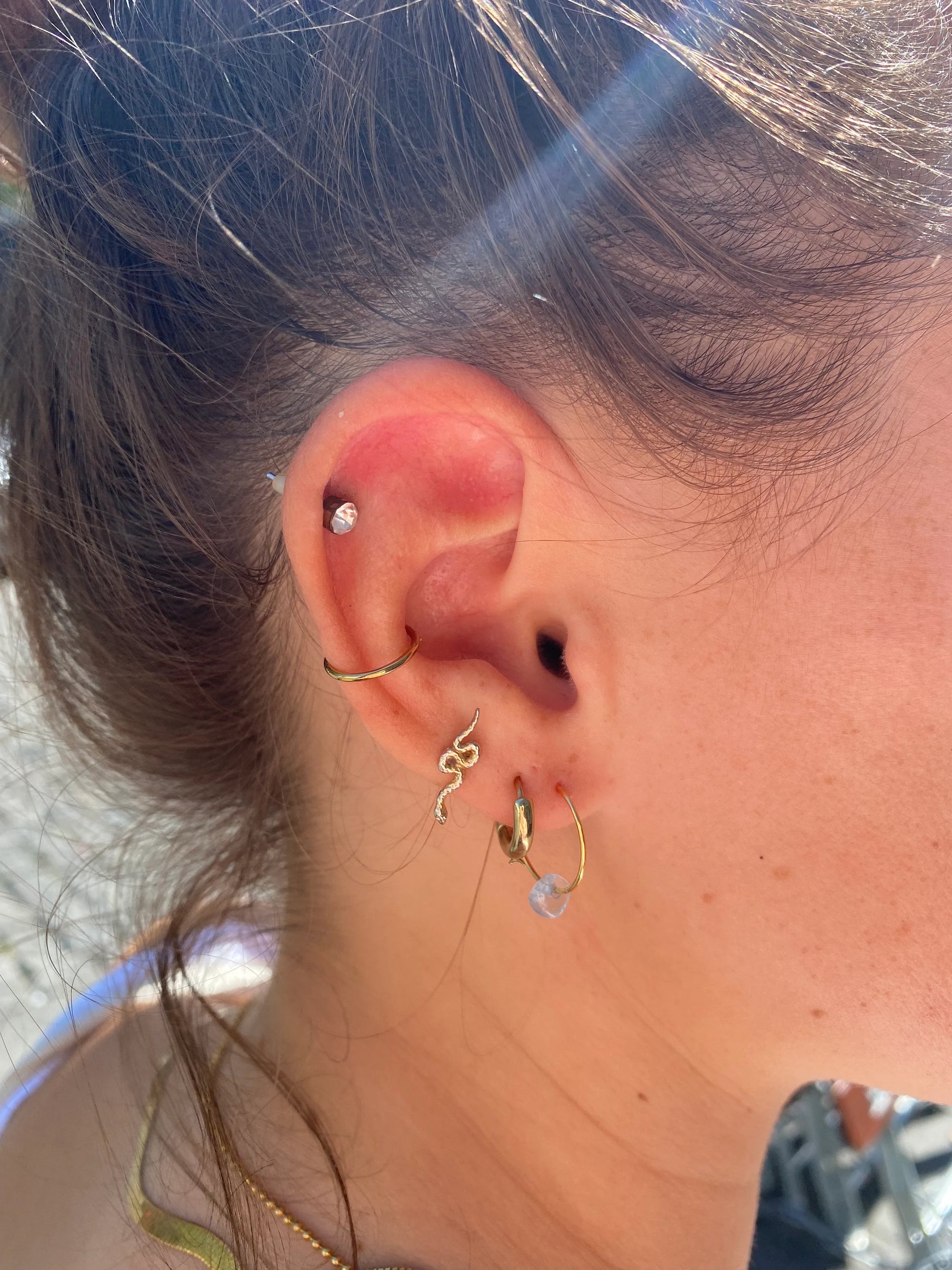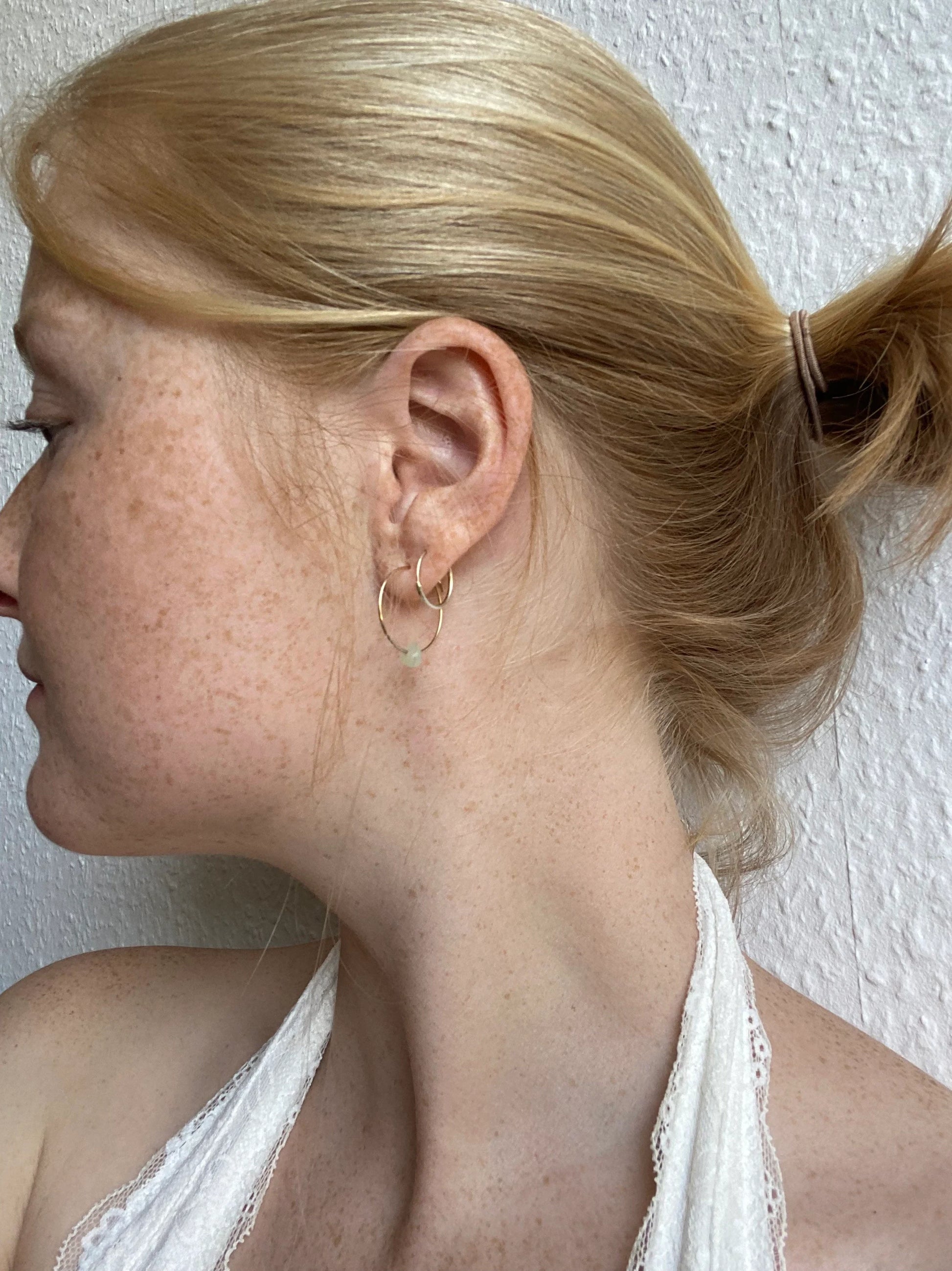 Hier seht ihr meine selbstgemachten Ohrringe aus einem Edelstahl Creole und einem Edelstein.