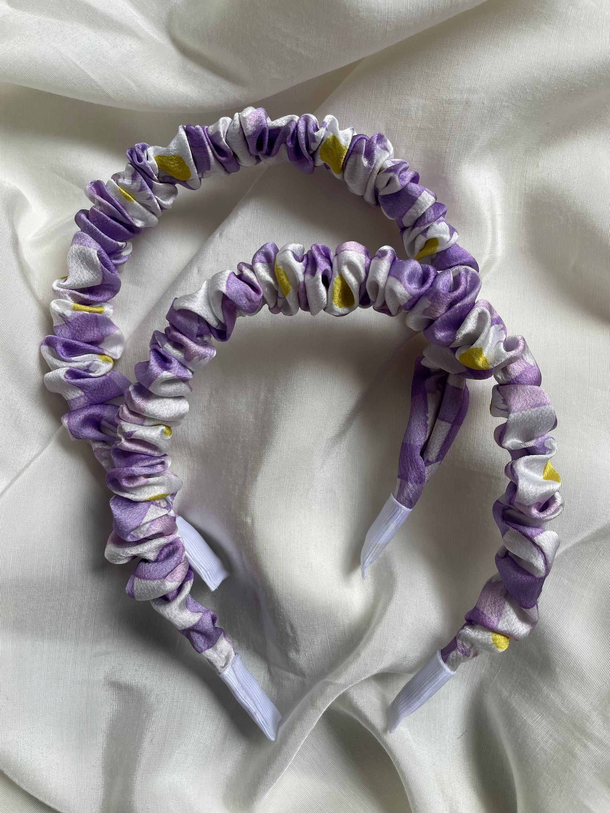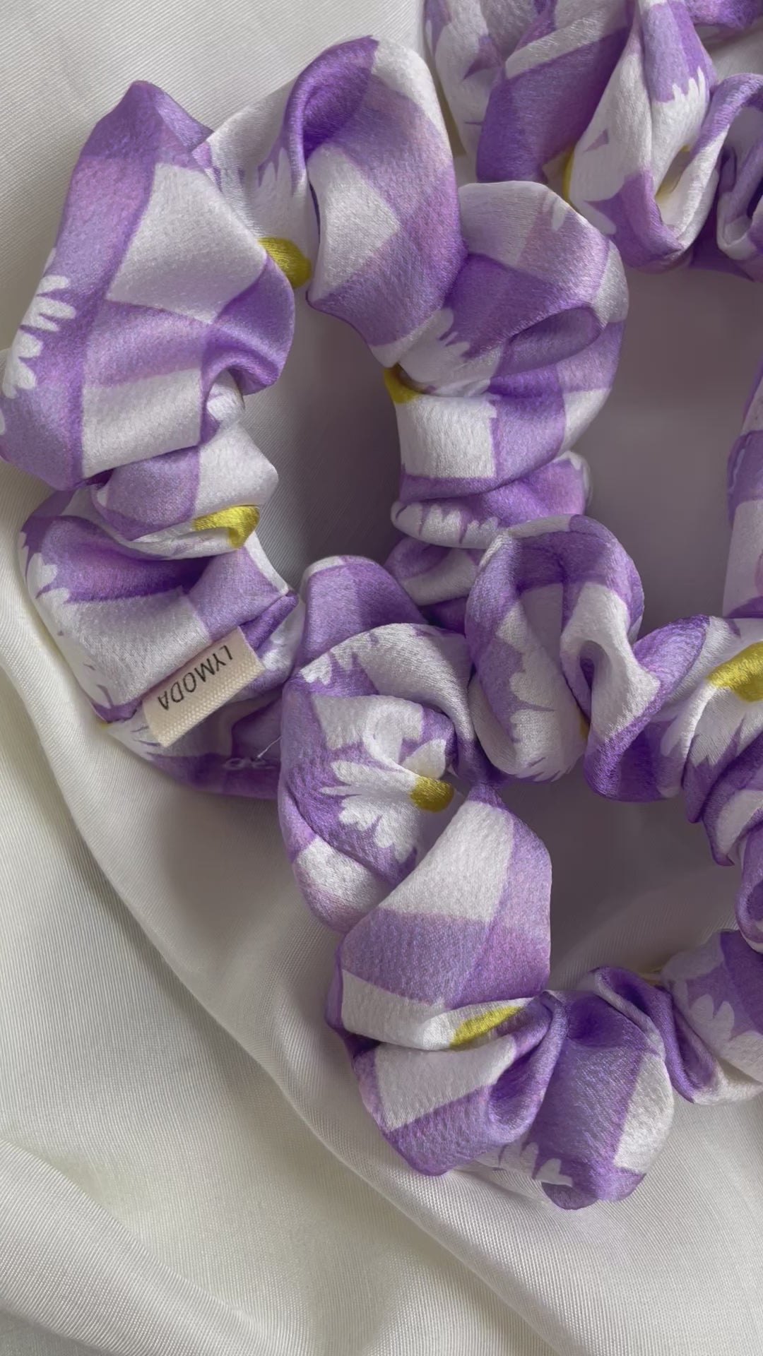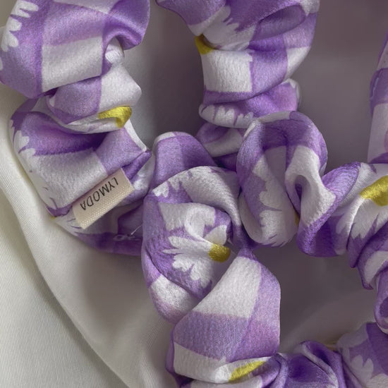 Hier seht ihr mein handgemachtes Scrunchie in Lila Weiß mit Gänseblümchen Muster. Das Scrunchie findet ihr in zwei verschiedenen Größen. Der Stoff ist wirklich super super weich, und somit sehr schonend für die Haare.