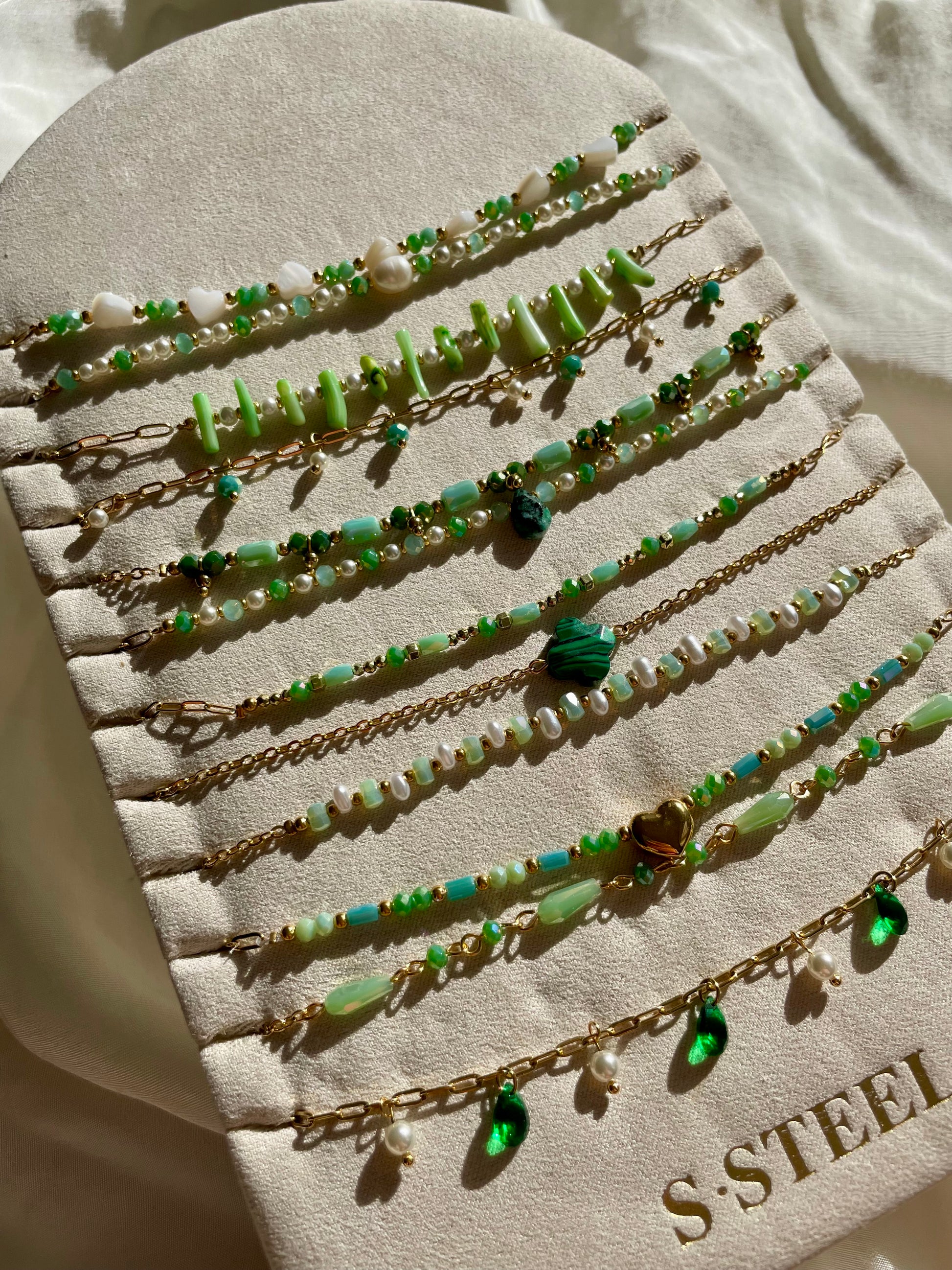 Hier siehst du viele verschiedene Ketten in einem wunderschönen Matcha farbenden goldenen Design. Insgesamt kannst du auswählen zwischen 12 Ketten, jede Kette ist nur 1x verfügbar. Die Ketten sind inklusive Verlängerung 50cm lang, ohne 45cm.