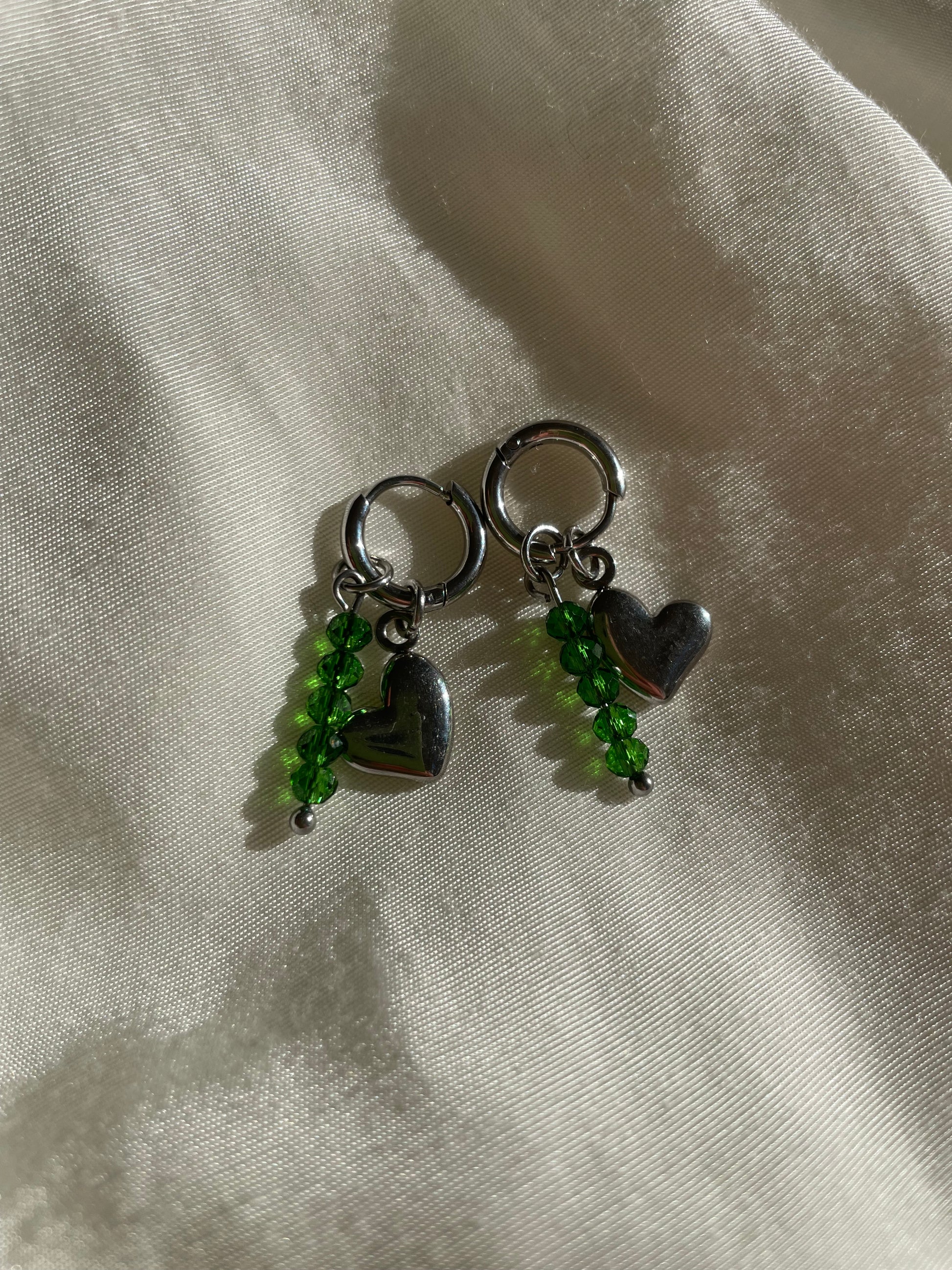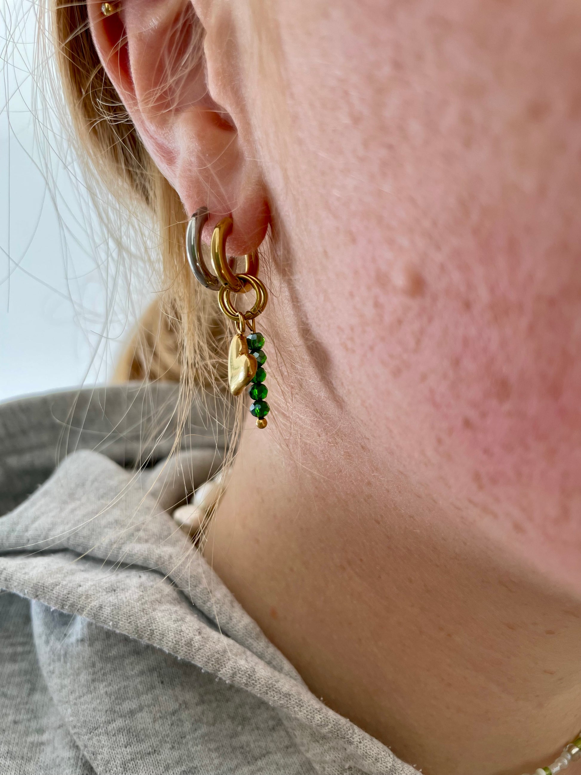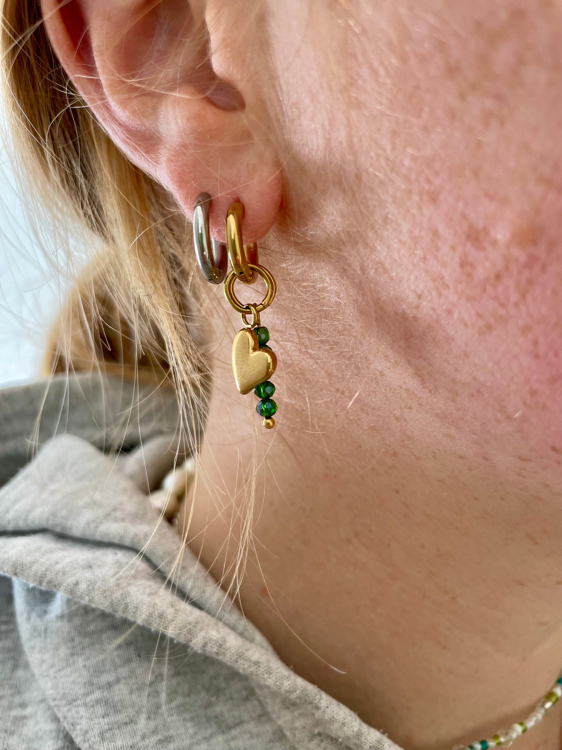 Hier siehst du die wunderschönen Matcha Herz Ohrringe in Gold. Der Ohrring zeichnet sich aus durch schöne Match Farben Edelstahl Charms, einem Herz Charm und einer 1cm Creole in Gold.