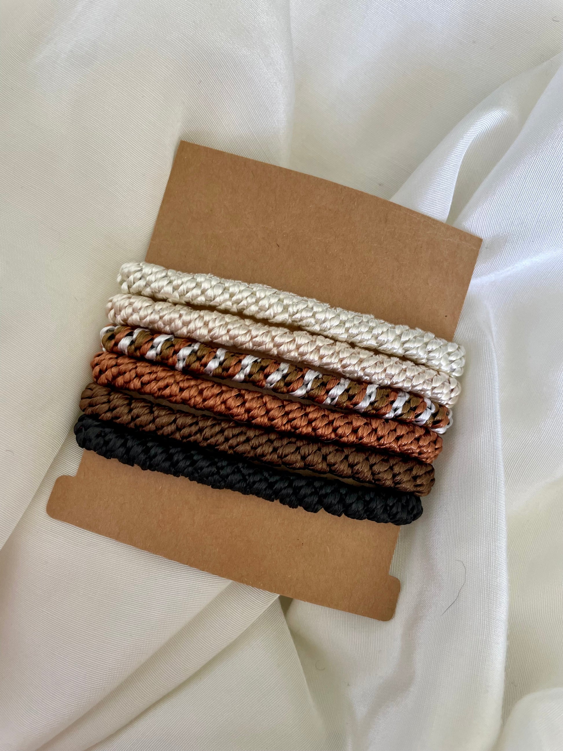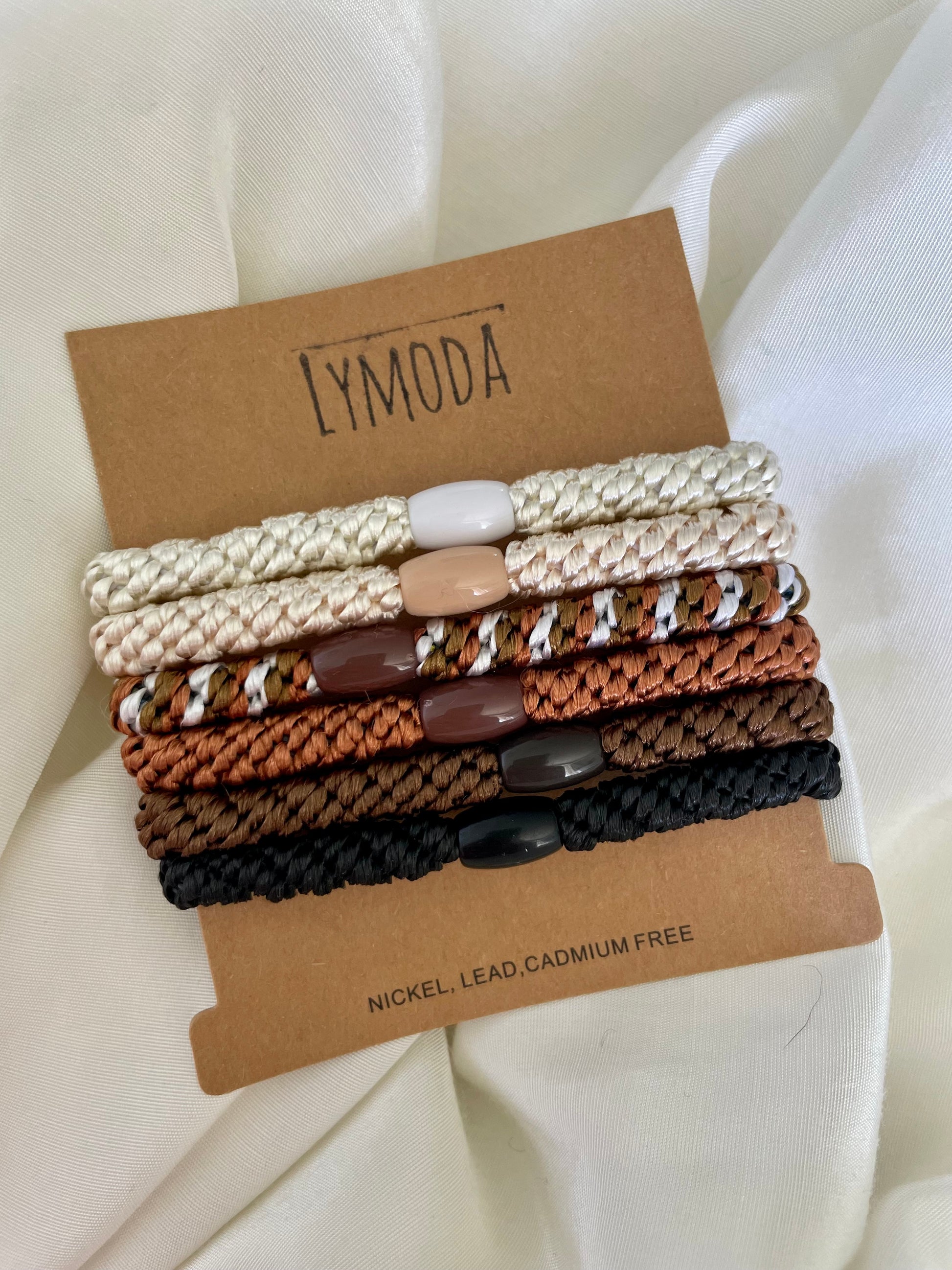 Hier seht ihr mein wunderschönes Haargummi Set Basic. Ein Set enthält 6 Haargummis. Ihr könnte für Haargummis aber auch einzeln erwerben. Besonders geeignet sind diese Haargummis für festes und dickes Haar, können aber auch genauso gut bei allen andern Haaren benutzt werden. Das Haargummi ist circa 8mm dick.