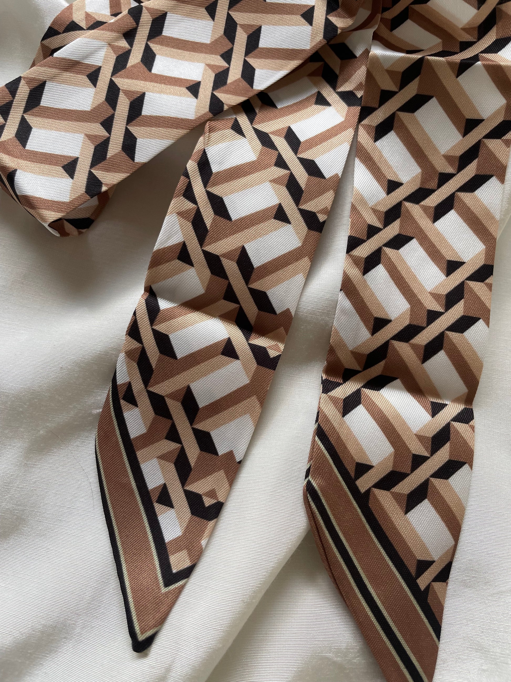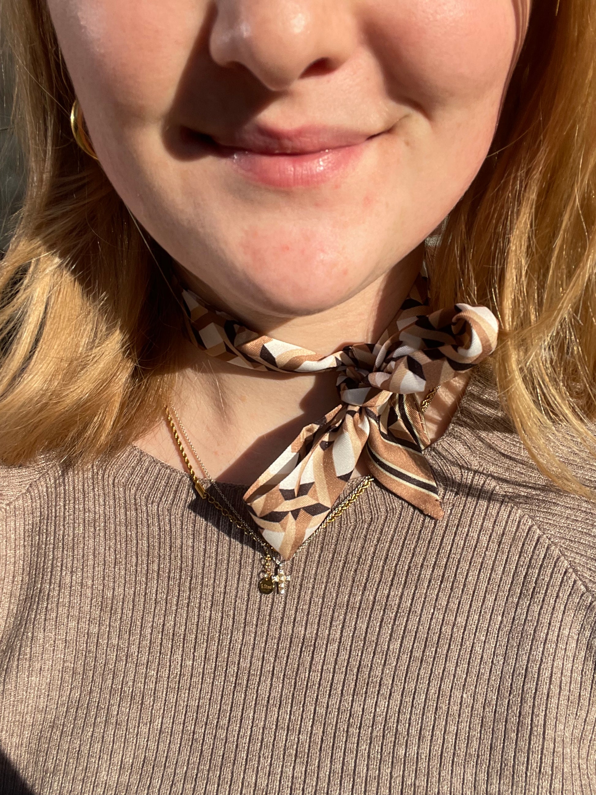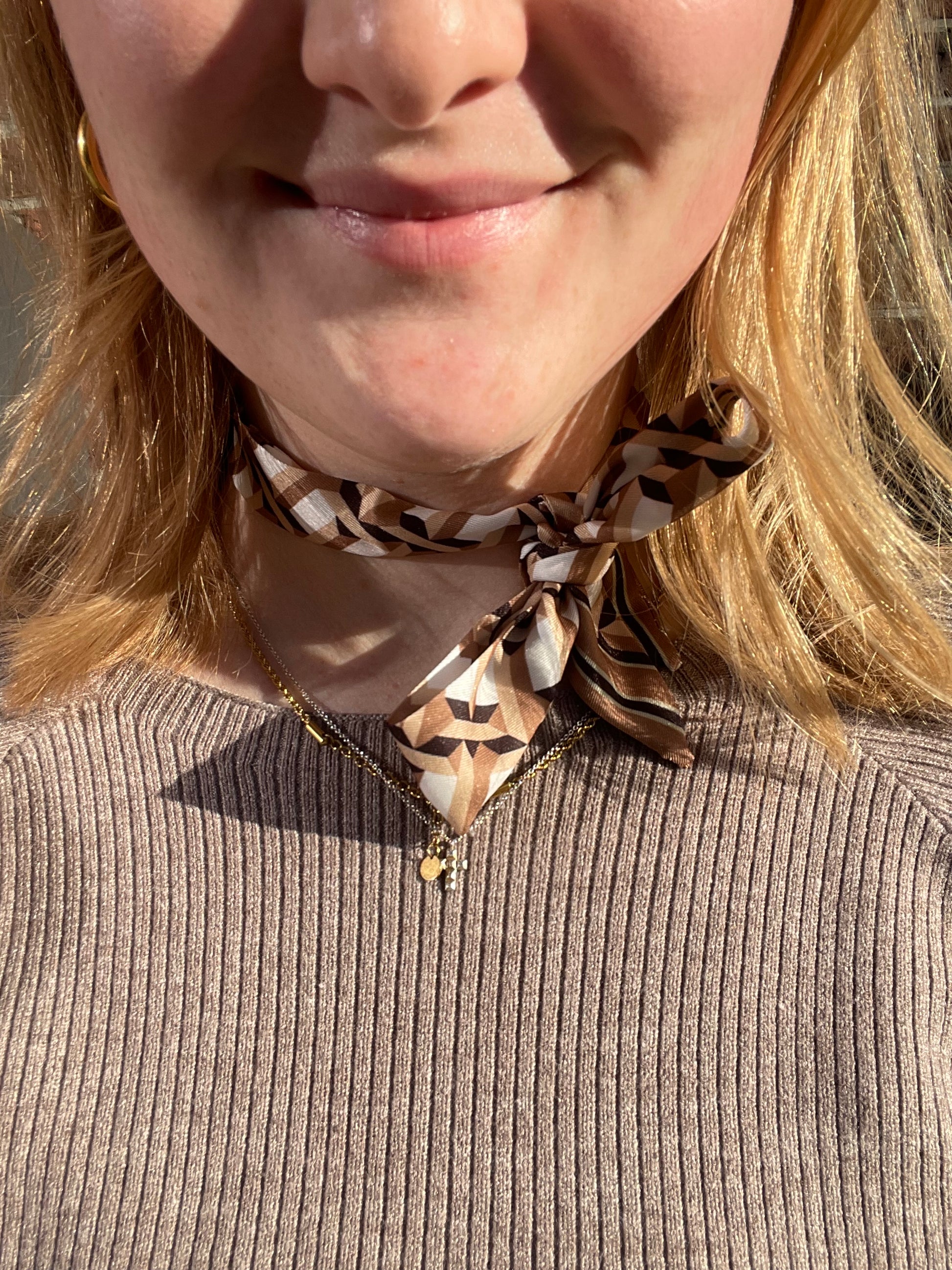Der Haarschal in einem wunderschönen Beigen strukturierten Muster ist nicht nur ein stylisches Accessoire für deine Haare, sondern auch vielseitig einsetzbar als Halstuch oder schickes Taschentuch. Wer genau hinschaut entdeckt die wunderschönen goldenen Enden. Mit einer Größe von 90x5cm sorgt er für den perfekten Look und einzigartige Akzente in deinem täglichen Outfit. Ein Must-Have für alle trendbewussten Fashionistas!