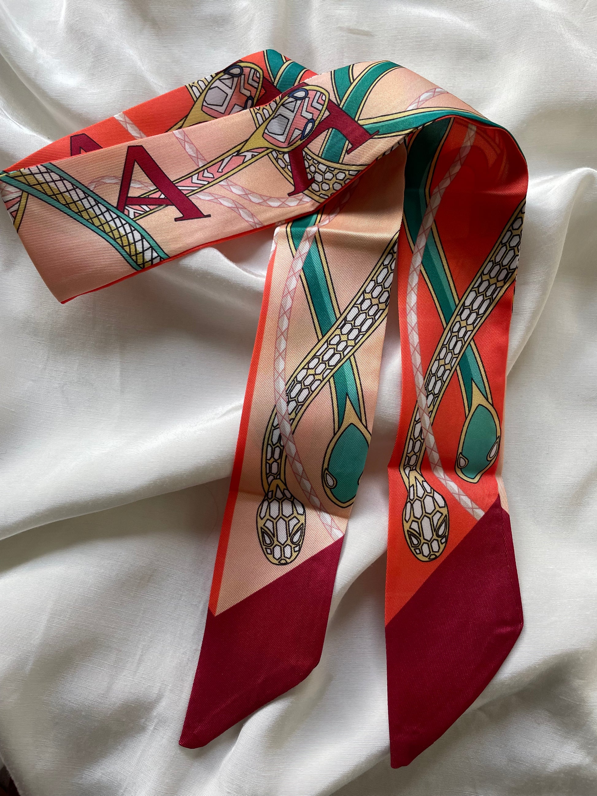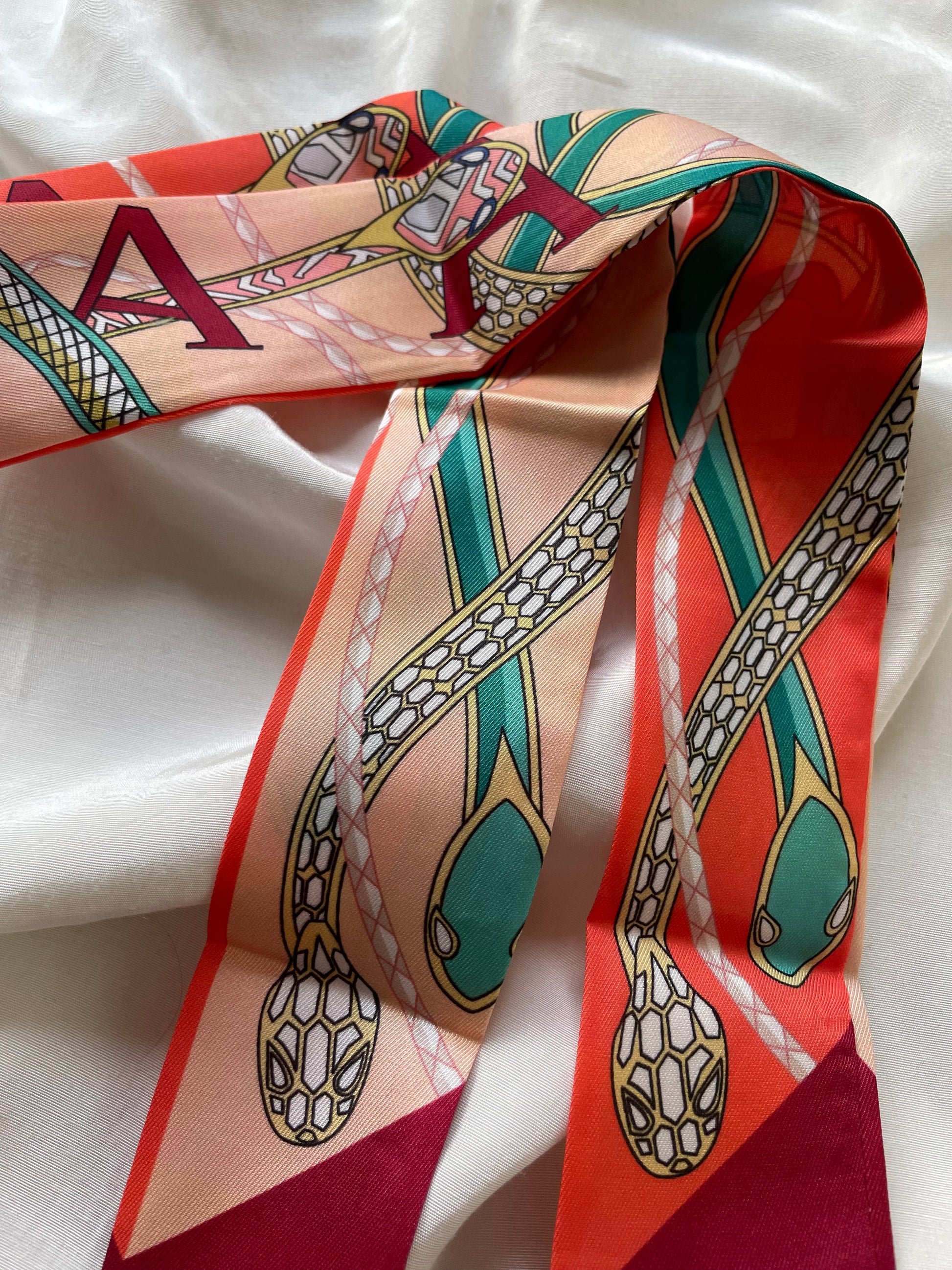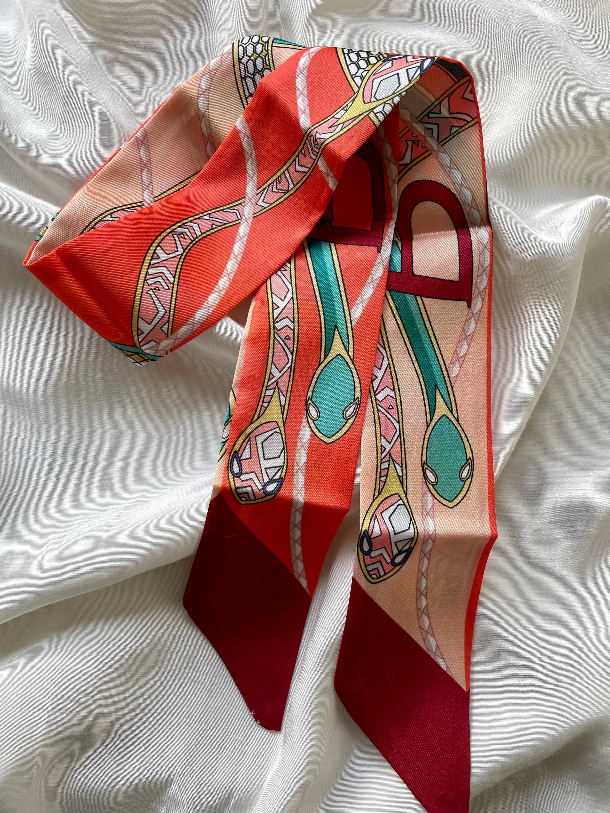 Der Haarschal in einem wunderschönen Orange-Weiß-Grünen Muster ist nicht nur ein stylisches Accessoire für deine Haare, sondern auch vielseitig einsetzbar als Halstuch oder schickes Taschentuch. Wer genau hinschaut erkennt die Schlange auf dem Tuch. Mit einer Größe von 90x5cm sorgt er für den perfekten Look und einzigartige Akzente in deinem täglichen Outfit. Ein Must-Have für alle trendbewussten Fashionistas!