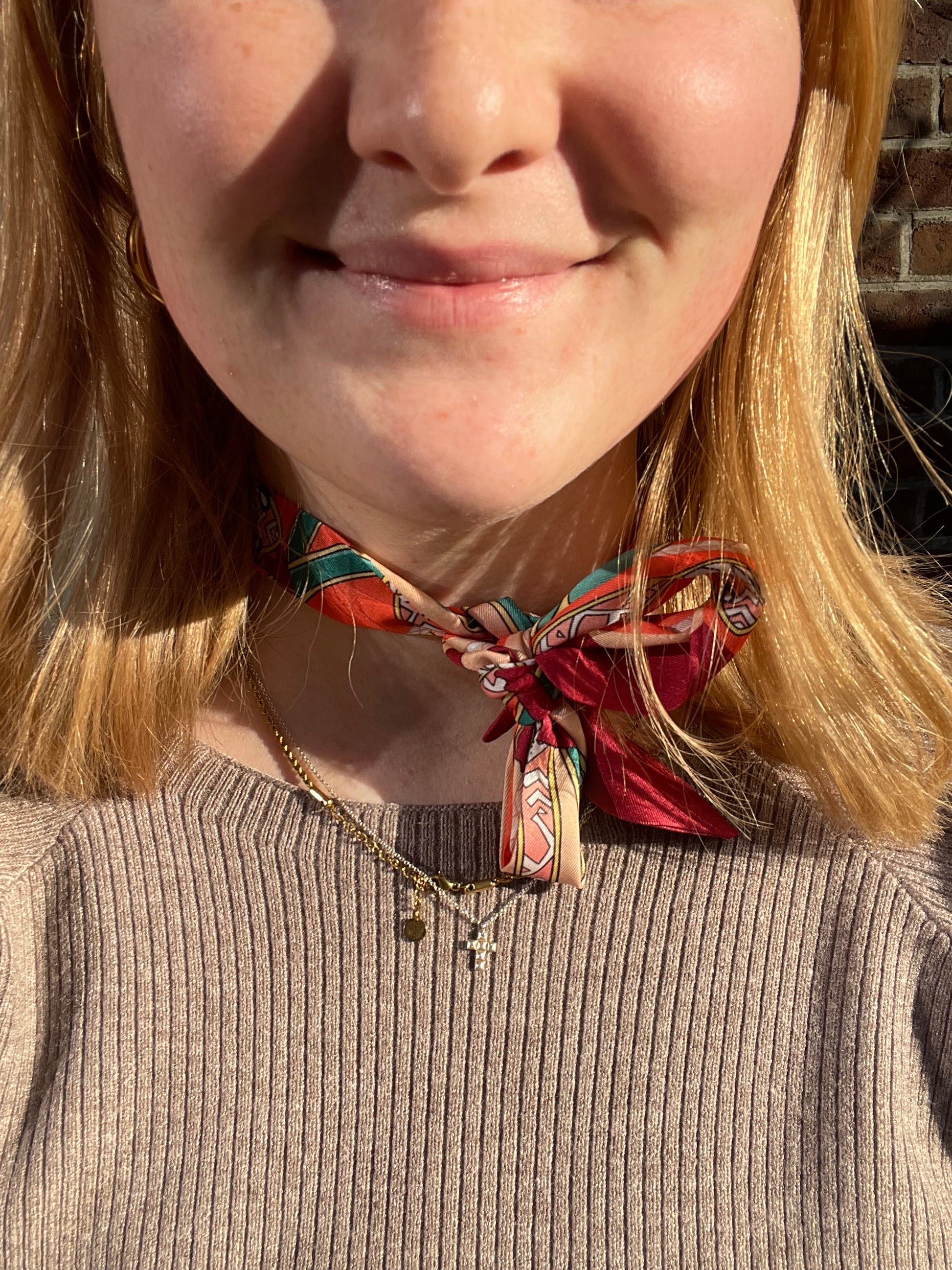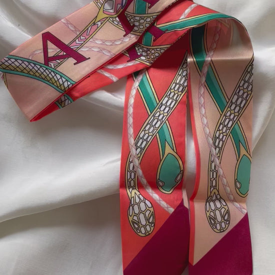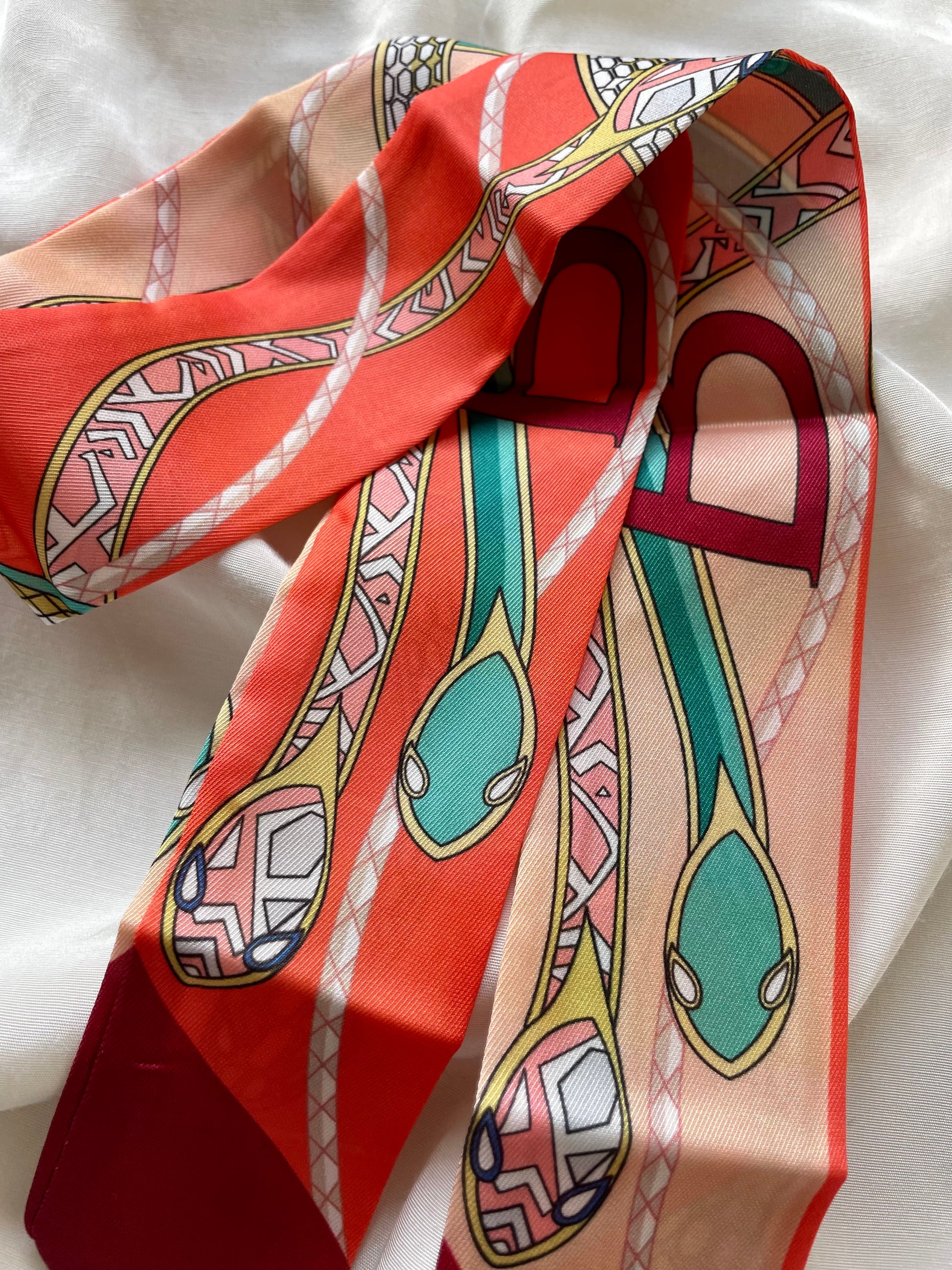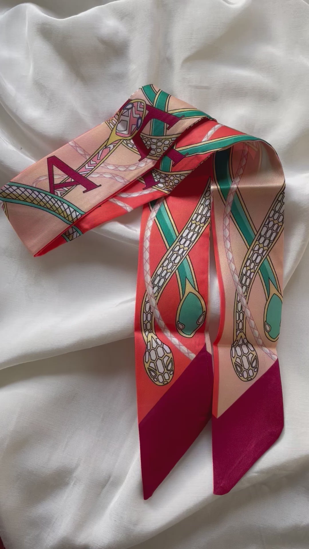 Der Haarschal in einem wunderschönen Orange-Weiß-Grünen Muster ist nicht nur ein stylisches Accessoire für deine Haare, sondern auch vielseitig einsetzbar als Halstuch oder schickes Taschentuch. Wer genau hinschaut erkennt die Schlange auf dem Tuch. Mit einer Größe von 90x5cm sorgt er für den perfekten Look und einzigartige Akzente in deinem täglichen Outfit. Ein Must-Have für alle trendbewussten Fashionistas!