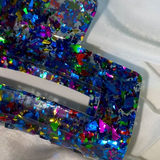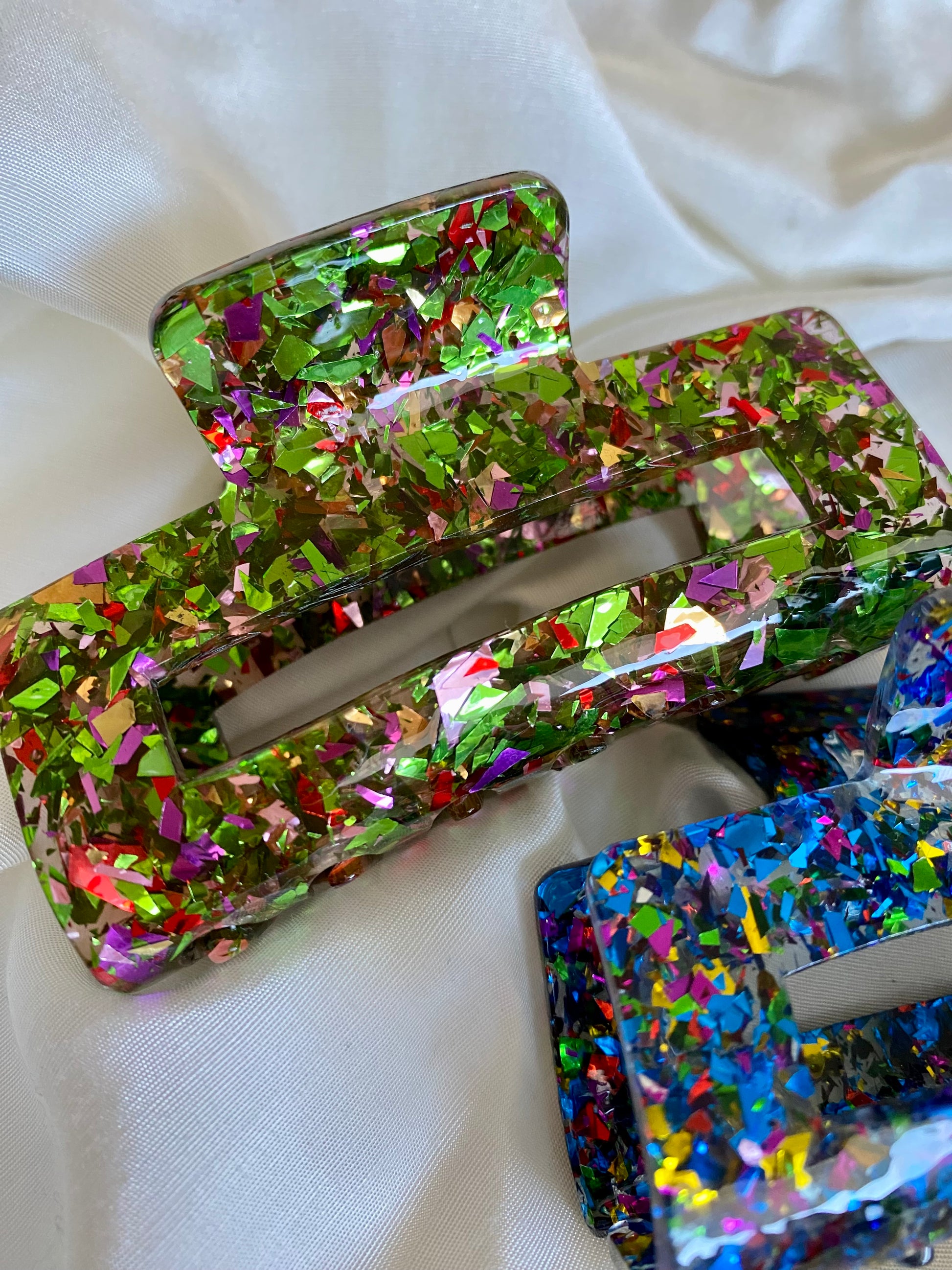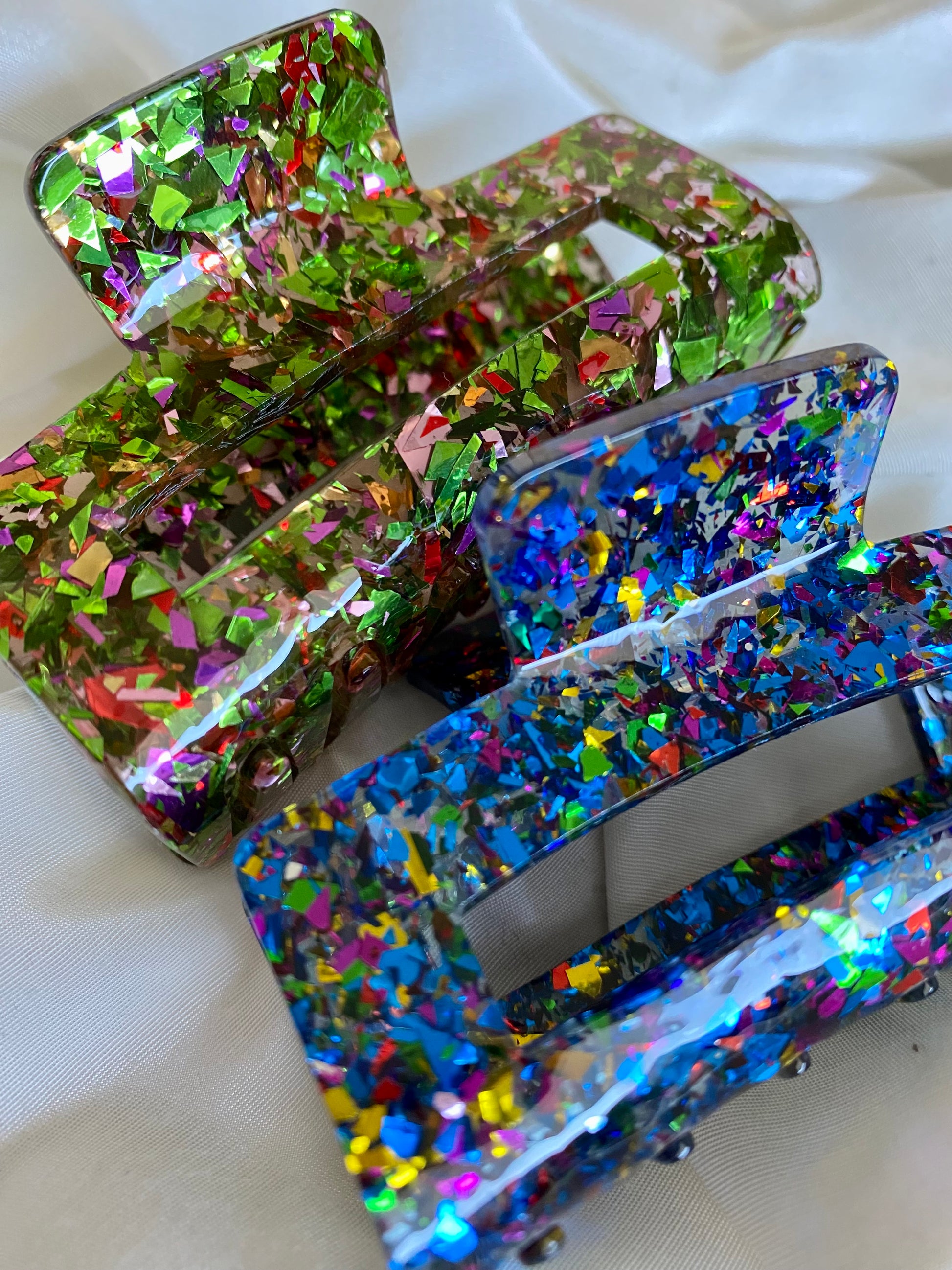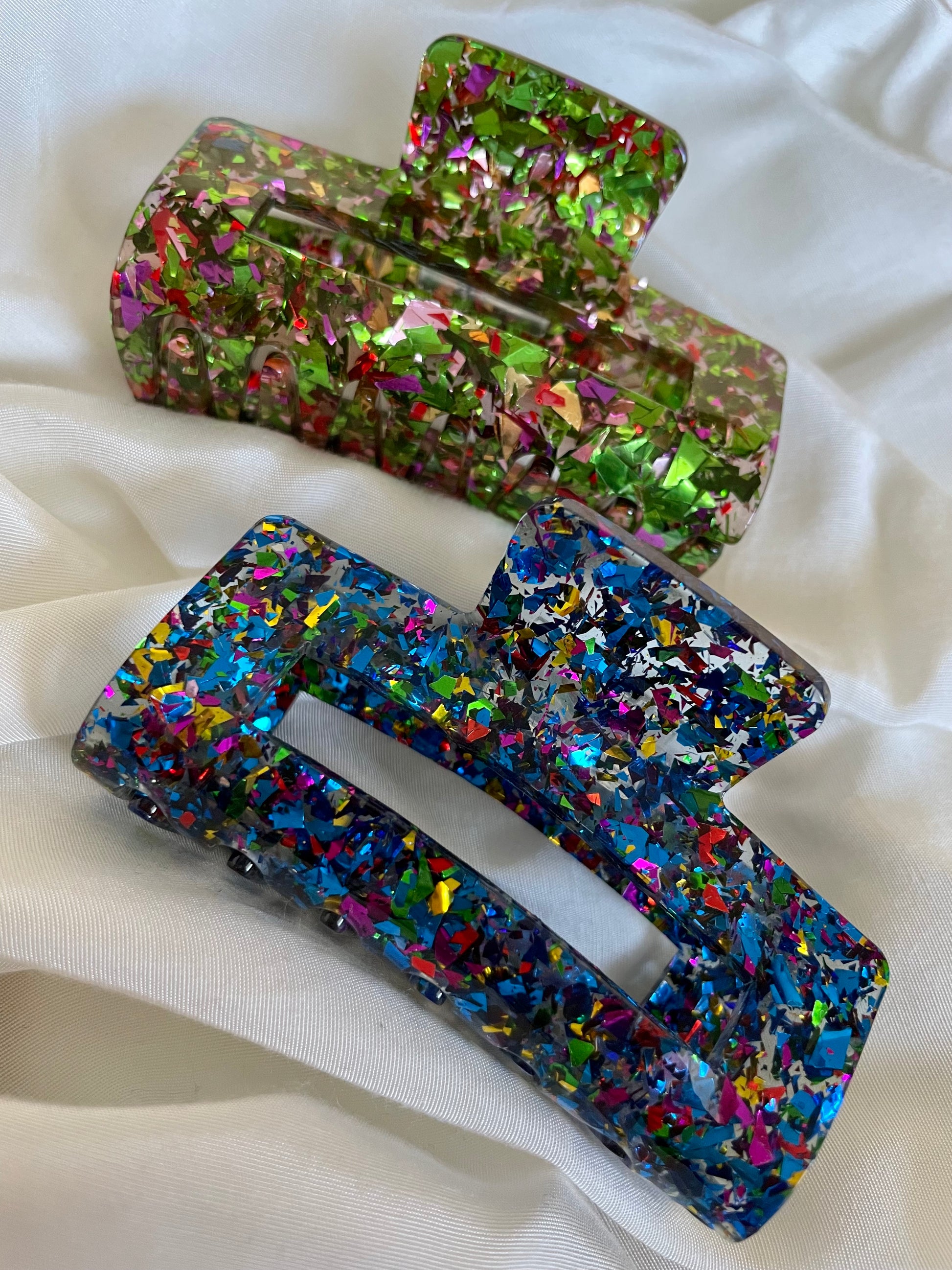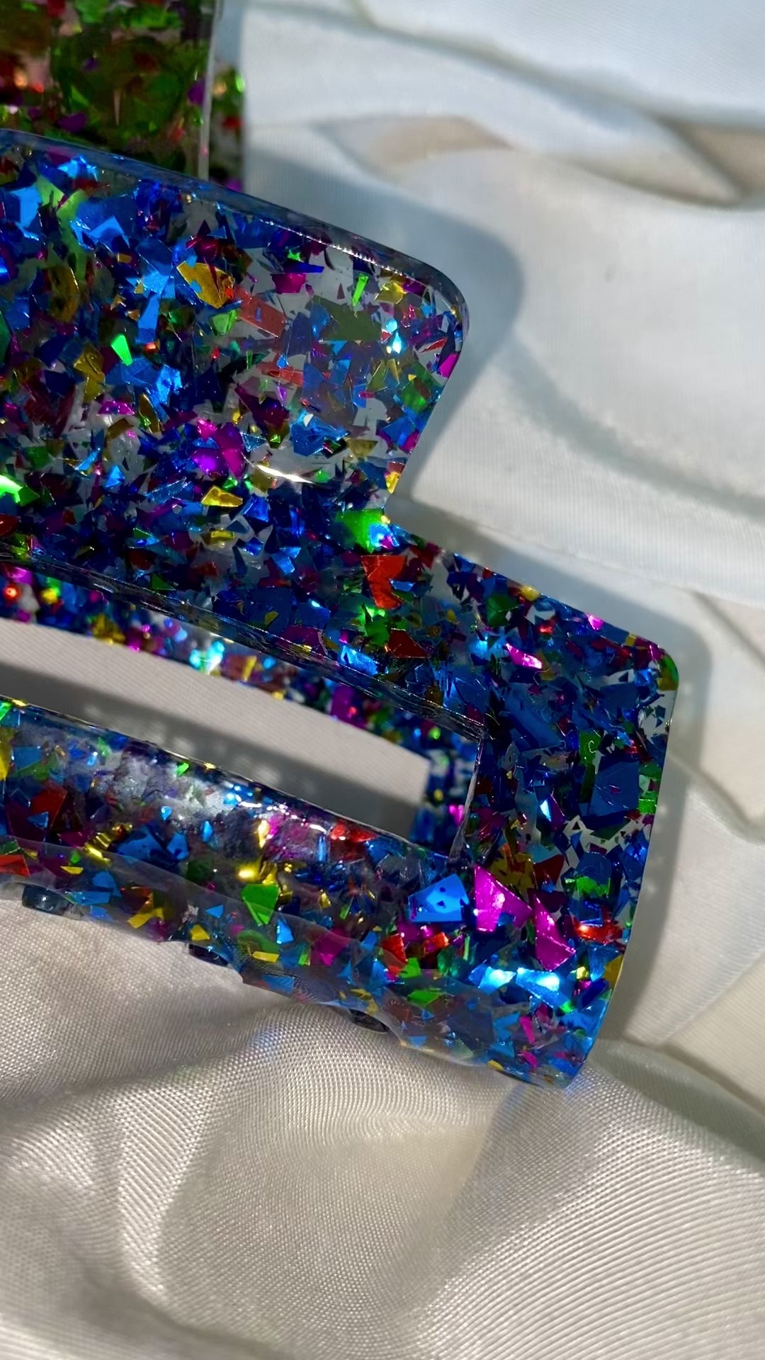 Hier siehst du mal eine mittelgroße Haarspange in einem wunderschönen Glitzer in grün und in blau. Wenn du genauer hin schaust, siehst du viele weitere Farben in dem Glitzer. Jeder Haarspange ist nur einmal verfügbar. Zaubere dir mit dieser Haarspange ein echter Hingucker in dein Haar.