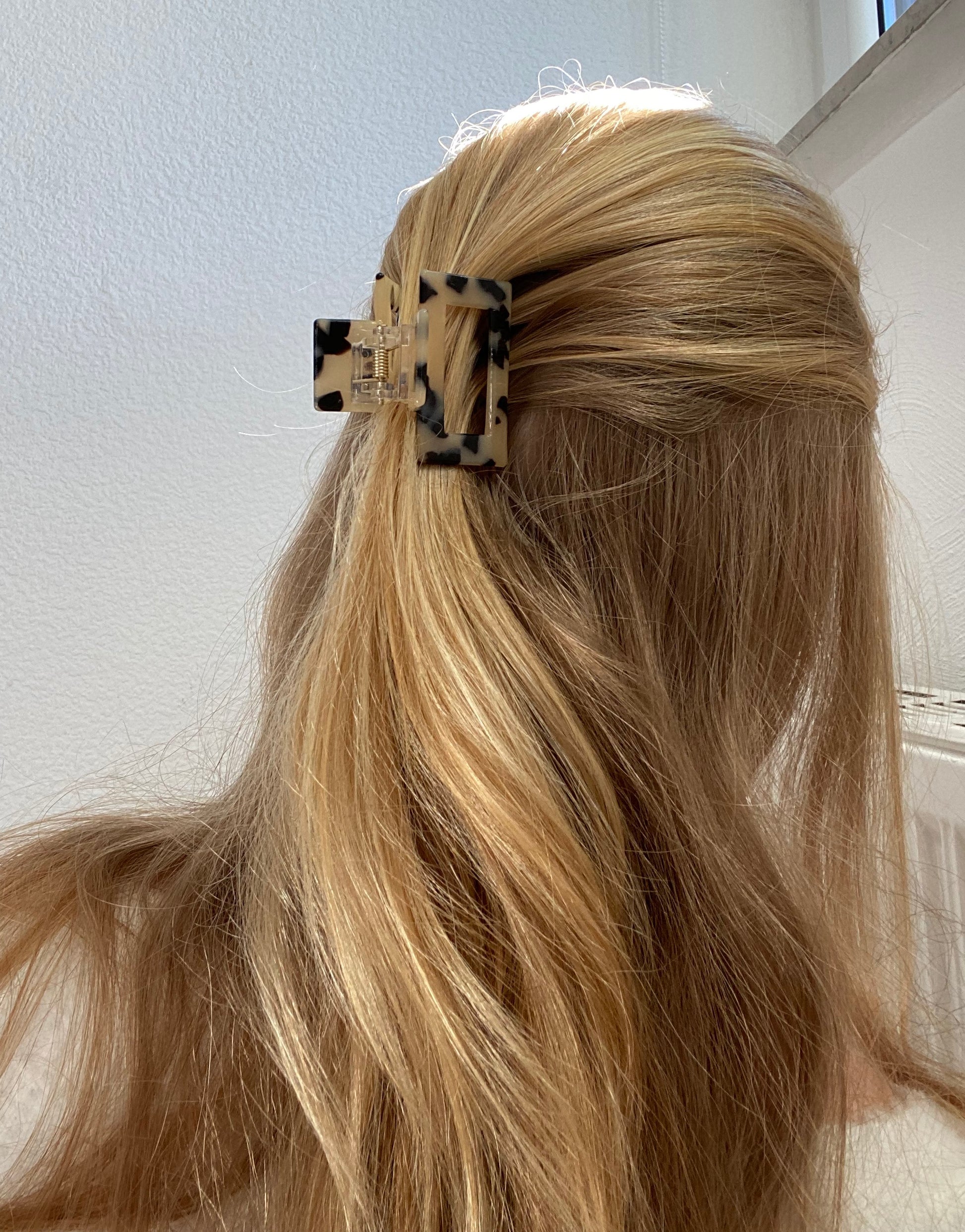 Verleih deinem Haar mit unseren mittleren Haarspange einen stylishen Look! Erhältlich in Rosa gemustert, Leo Hell und Leo Dunkel und Grün-Blau gemustert, bringt sie Farbe in deinen Alltag. Die mittelgroße rechteckige Form sorgt für einen sicheren Halt und einen verspielten Touch. Sie kann getragen werden um einige Haaren zusammen zu halten oder alle Haare hochzustecken.