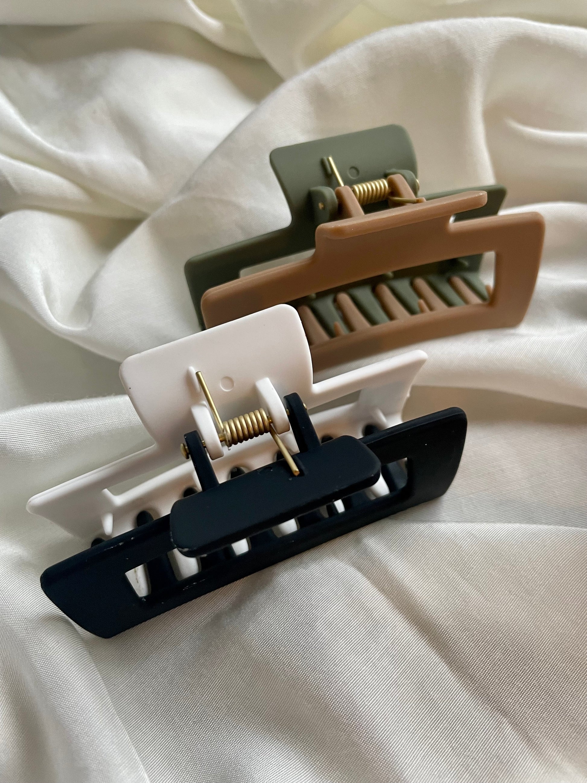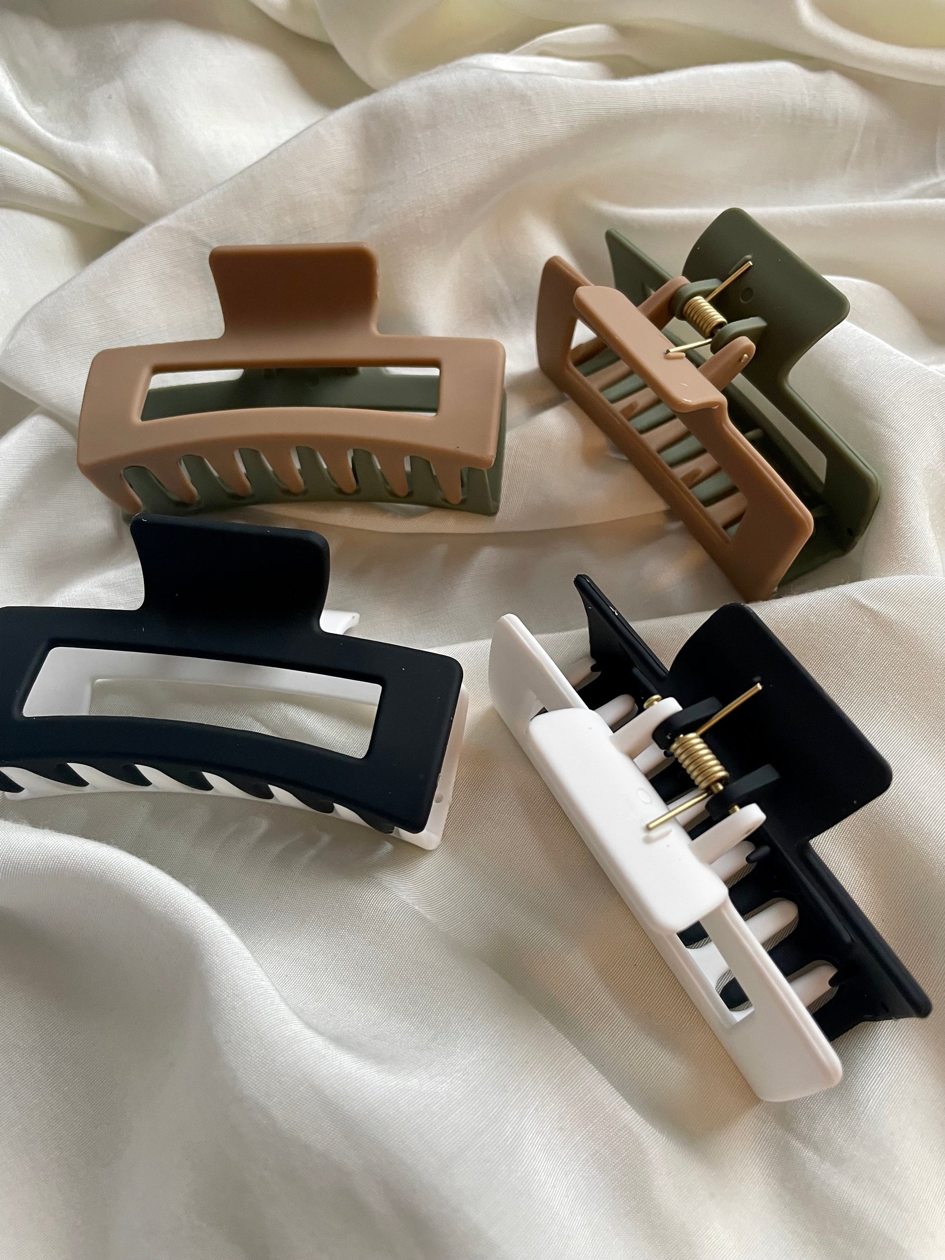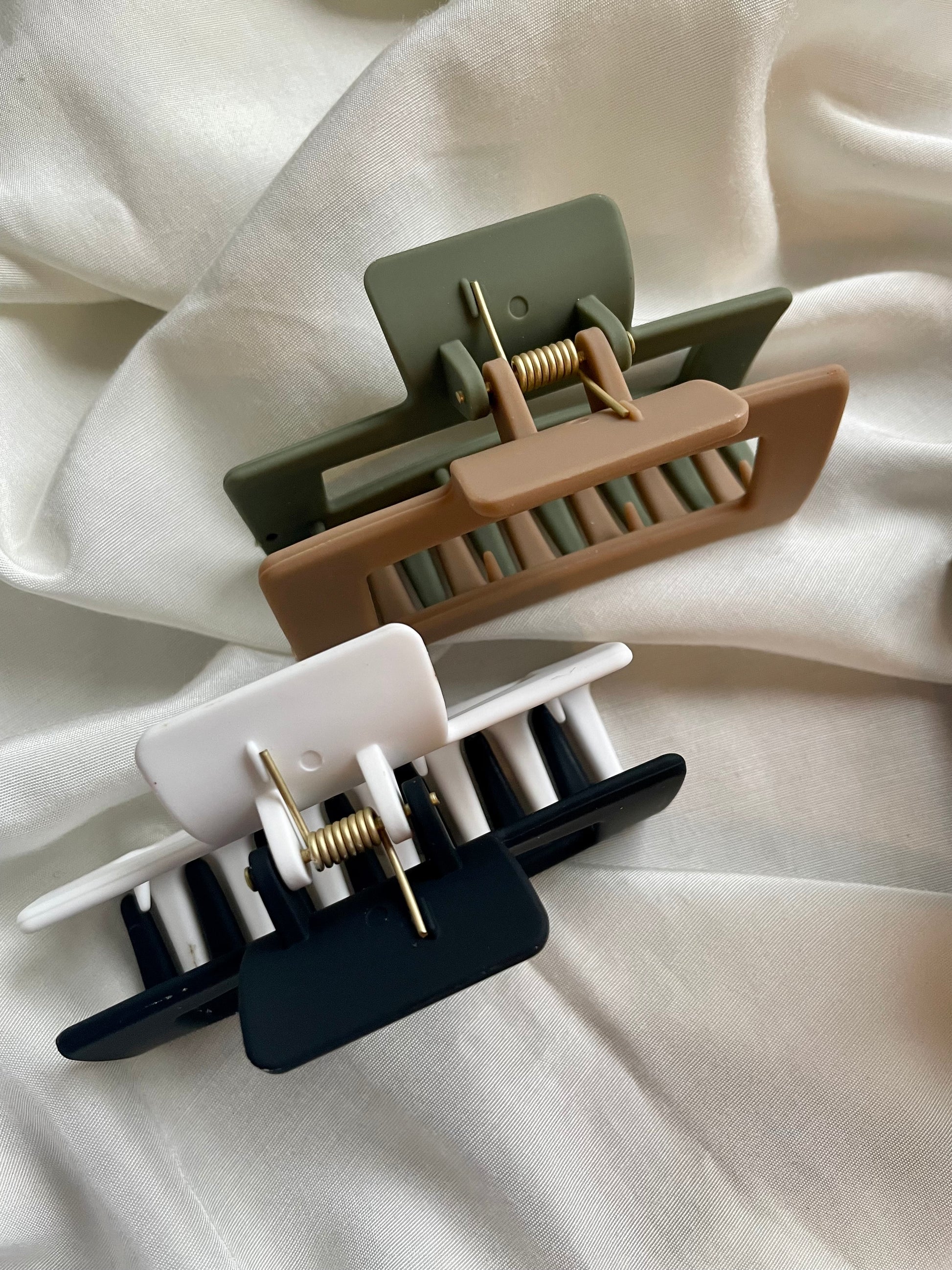 Hier seht ihr zwei verschiedene zweifarbige Haarspangen. Ihr könnt die Haarspange in schwarz-weiß oder in braun-grün erwerben. Die Haarspange es Mittel groß und hat eine matte Optik.