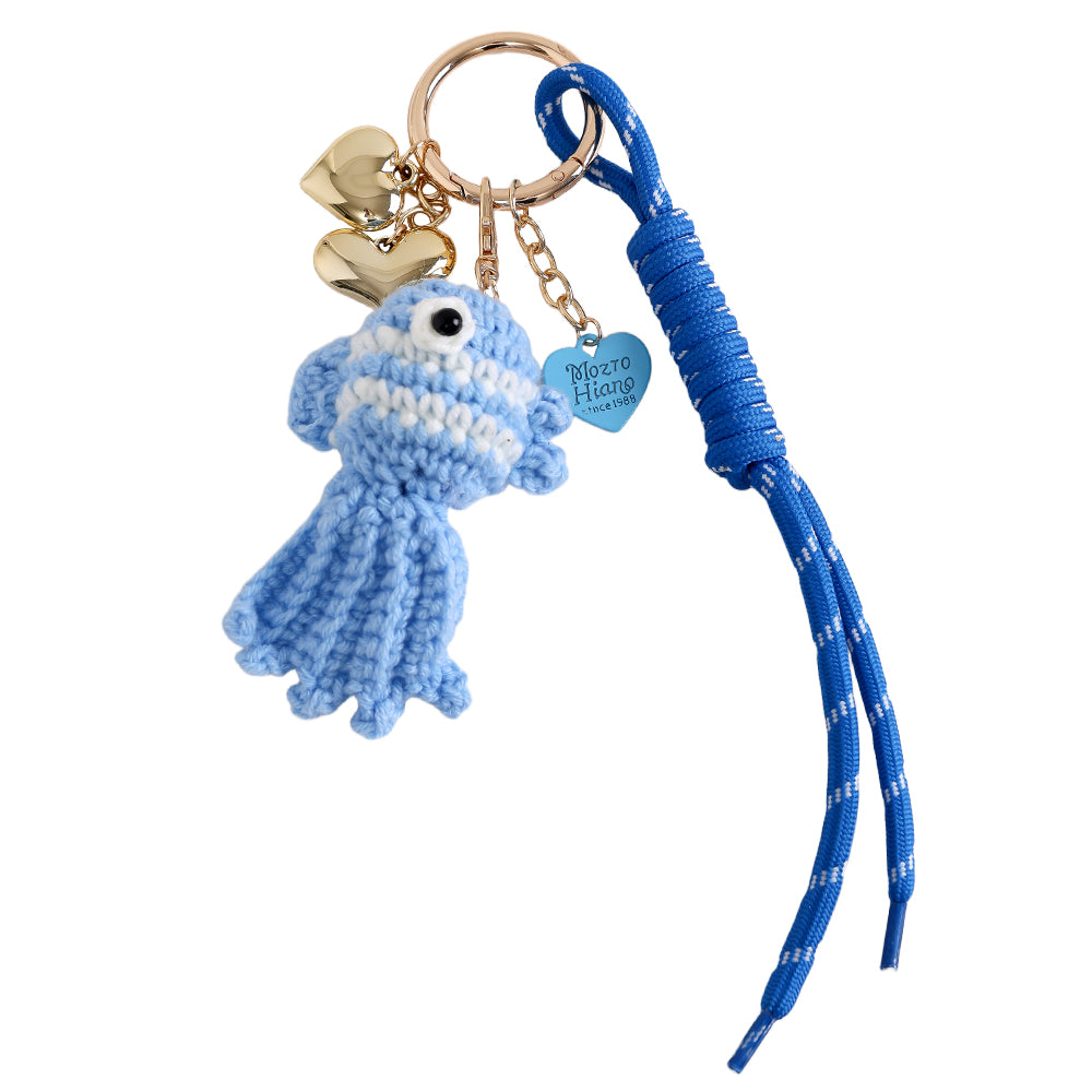 Dieser trendige Taschenanhänger ist ein absoluter Hingucker an deinem Schlüssel oder deiner Tasche. Mit dem goldenen Karabiner und dem süßen gehäkelten Fisch, der mit einem blauen Band und goldenen Herzen verziert ist er nicht nur praktisch, sondern auch ein echter Blickfang. Die beiden verschiedenen Kordeln und die Möglichkeit diese an alles mögliches dran zu machen ihn zu einem einzigartigen Accessoire.