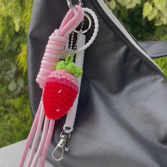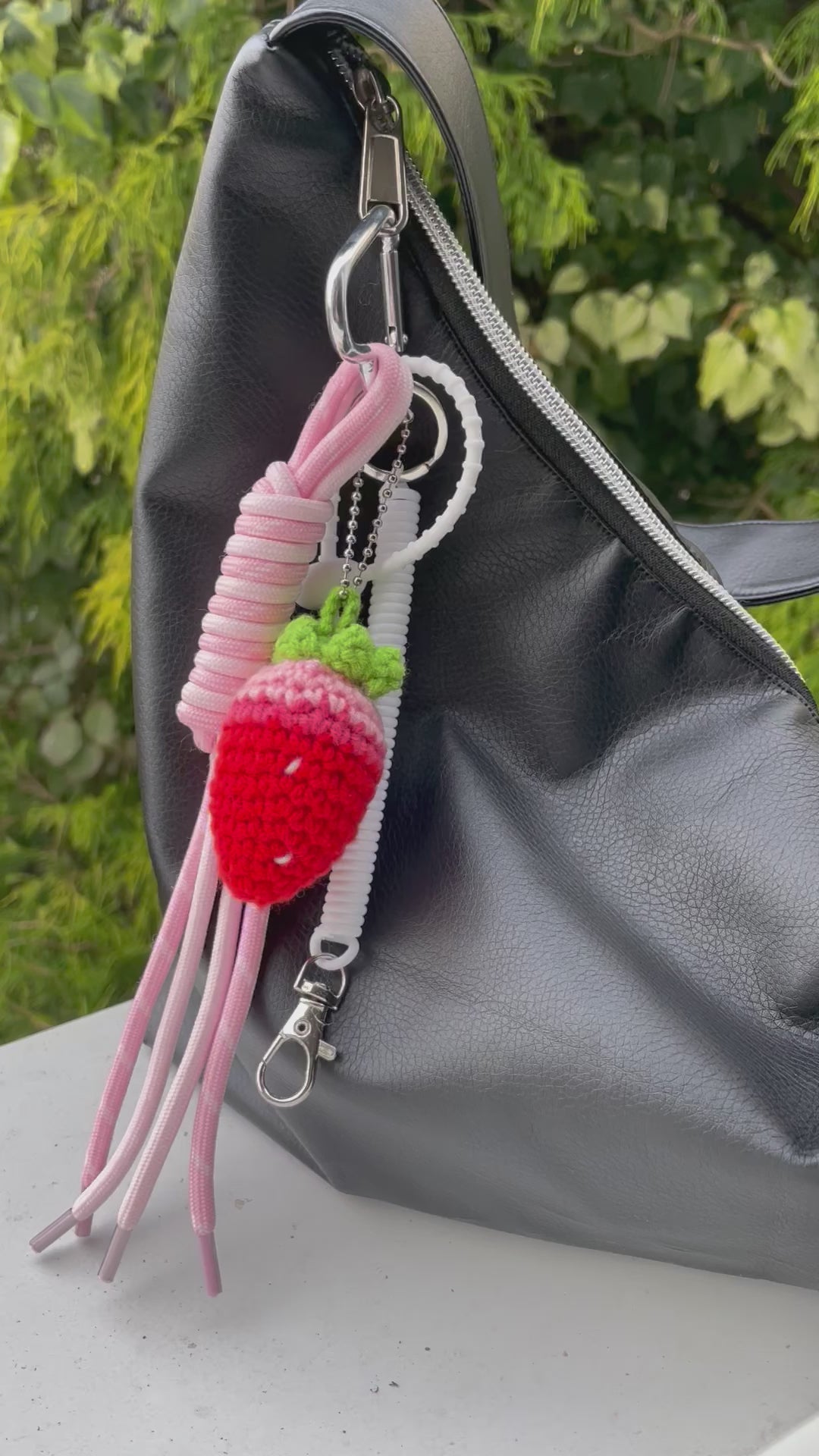 Dieser trendige Taschenanhänger ist ein absoluter Hingucker an deinem Schlüssel oder deiner Tasche. Mit dem Karabiner und der süßen gehäkelten Erdbeere mit rosa und weißen Bändern verziert ist er nicht nur praktisch, sondern auch ein echter Blickfang. Die beiden verschiedenen Kordeln und die Möglichkeit machen ihn zu einem einzigartigen Accessoire.