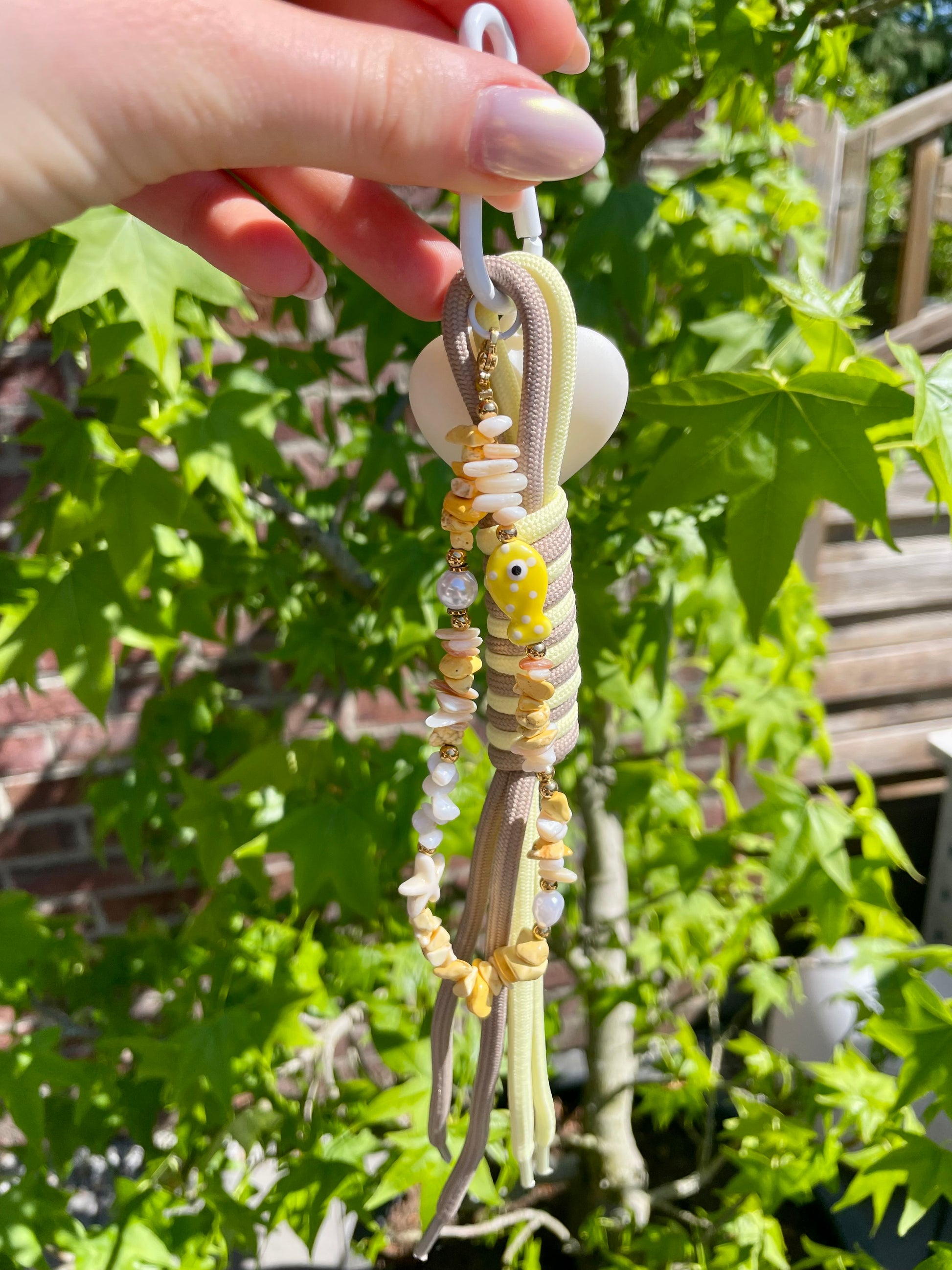 Dieser trendige Taschenanhänger ist ein absoluter Hingucker an deinem Schlüssel oder deiner Tasche. Mit dem Karabiner, dem süßen Herz, die gelben Bändern und mit dem tollen Perlenband ist er nicht nur praktisch, sondern auch ein echter Blickfang. 🤍 Die beiden verschiedenen Kordeln und die Möglichkeit diese an alles mögliches dran zu machen ihn zu einem einzigartigen Accessoire.
