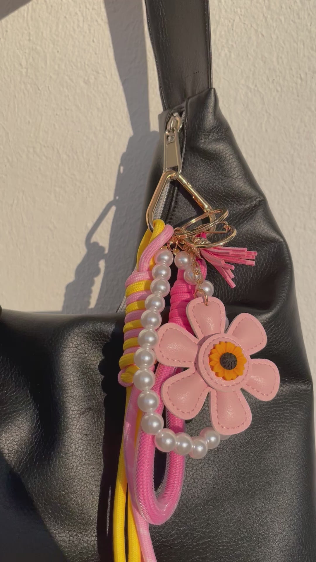 Dieser trendige Taschenanhänger ist ein absoluter Hingucker an deinem Schlüssel oder deiner Tasche. Mit dem Karabiner und der süßen Blume mit gelben und pinken Bändern verziert ist er nicht nur praktisch, sondern auch ein echter Blickfang. Die beiden verschiedenen Kordeln und die Möglichkeit diese an alles mögliches dran zu machen ihn zu einem einzigartigen Accessoire.