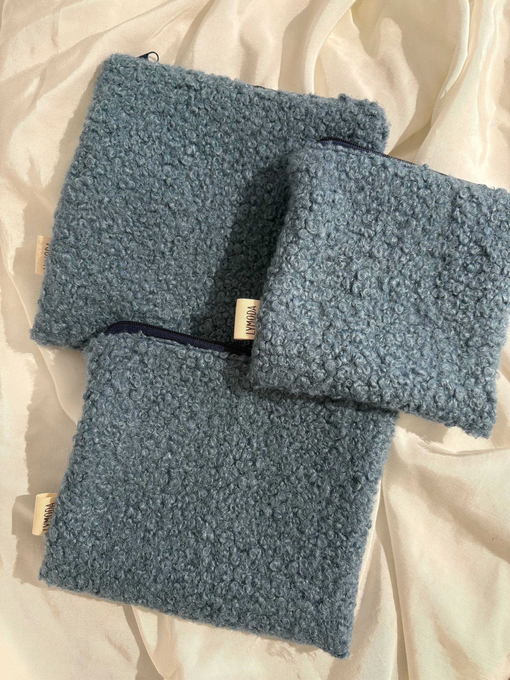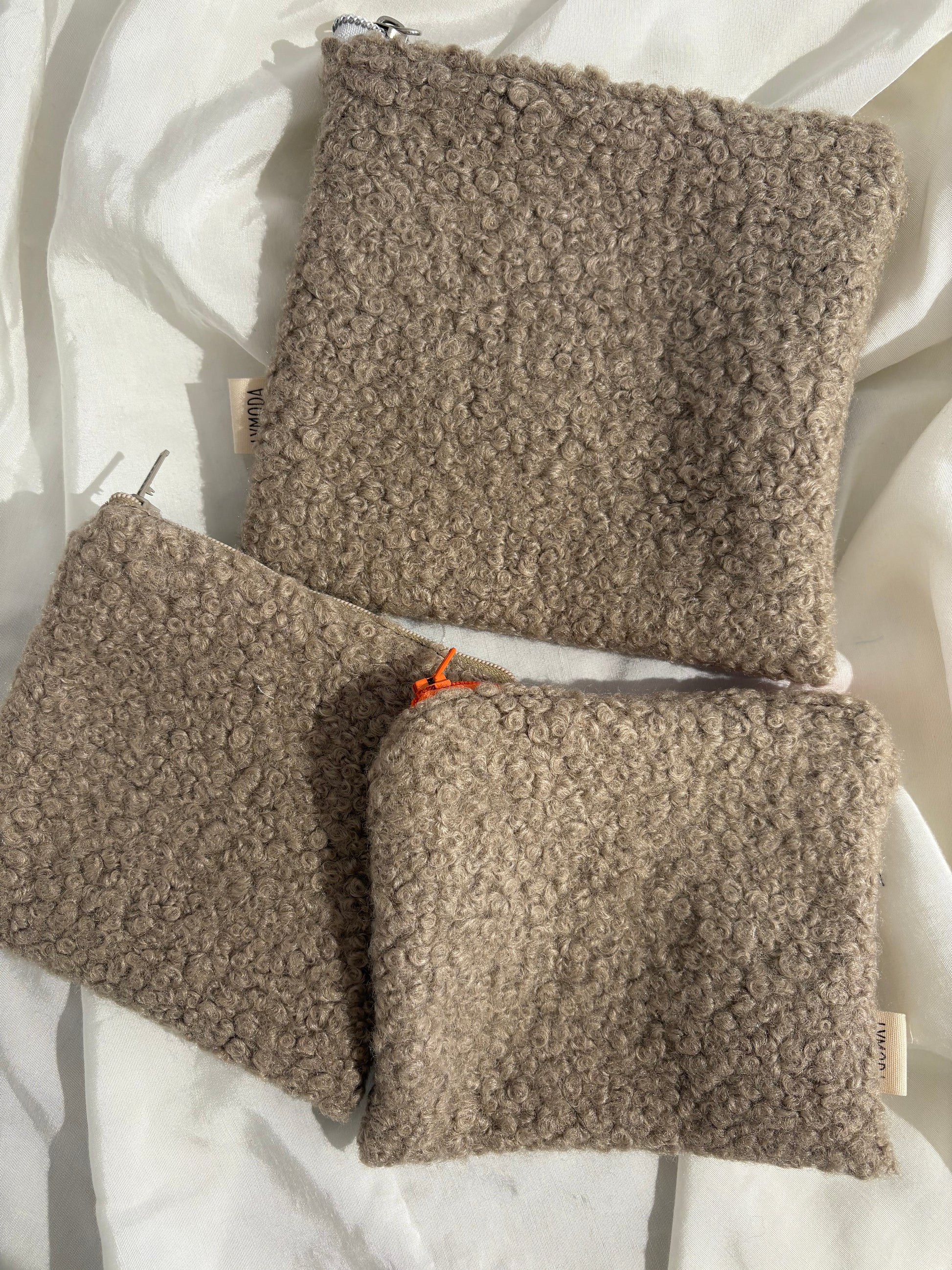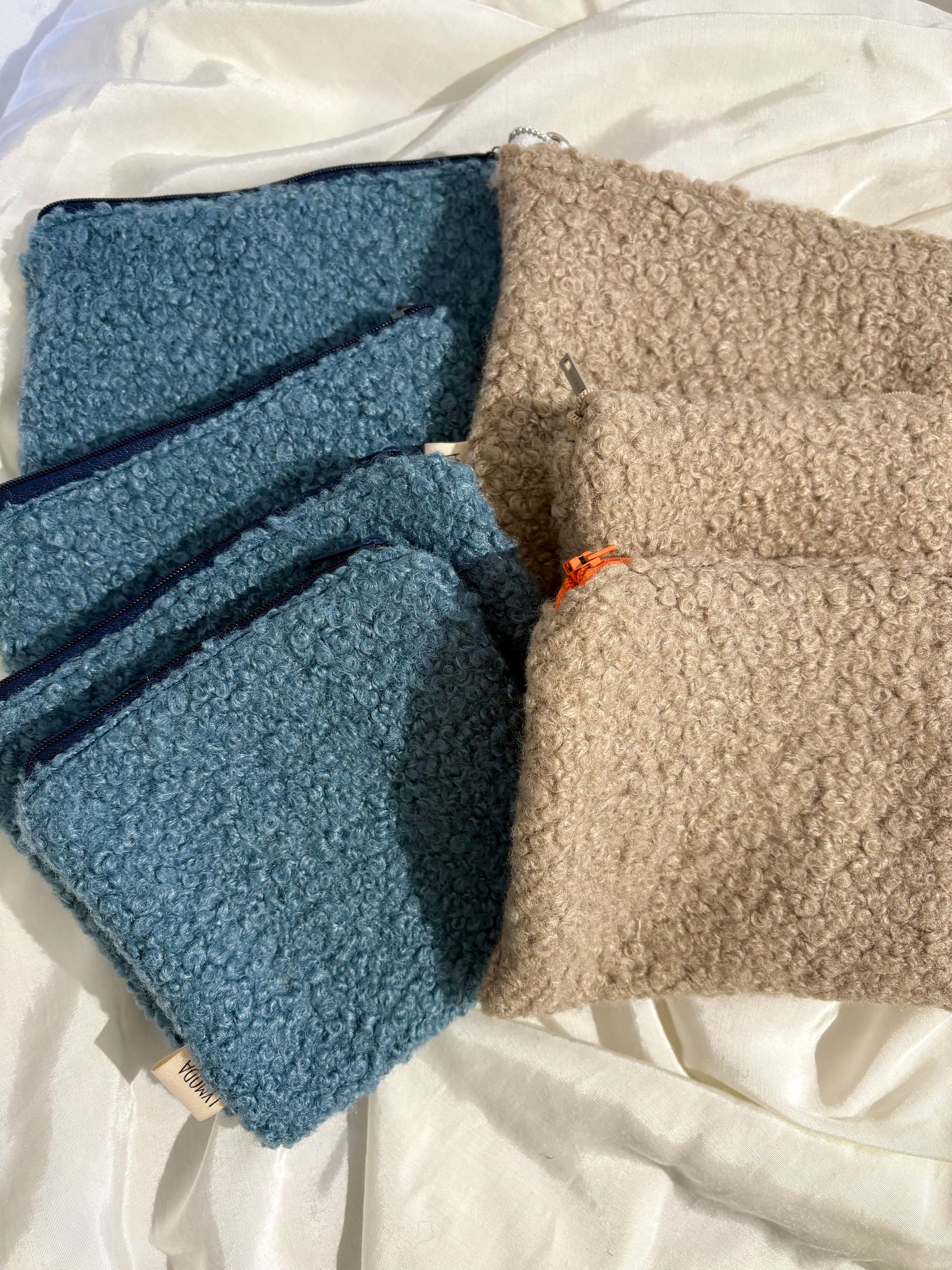 Hier siehst du die wunderschönen LYMODA Mini Bag in verschiedenen Größe aus einen super schönen Beigen und Blauen TeddyStoff. Als Innenstoff wurden verschiedenen Musterstoffe verwenden.