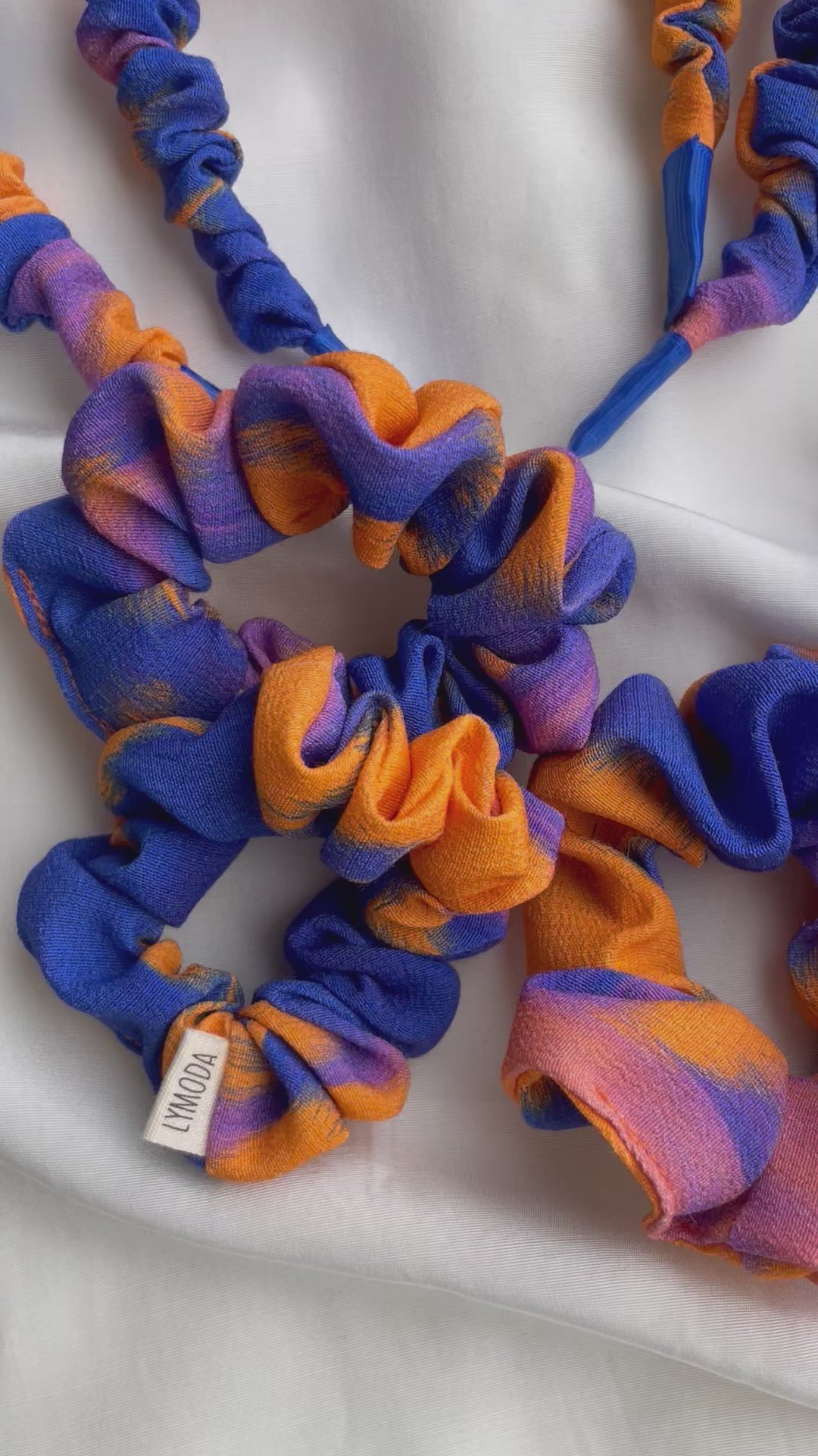 Hier seht ihr mein handgemachtes Scrunchie in einem orange blauen Muster. Das Scrunchie findet ihr in zwei verschiedenen Größen. Der Stoff ist wirklich super super weich, und somit sehr schonend für die Haare. Es handelt sich hier um Viskose.