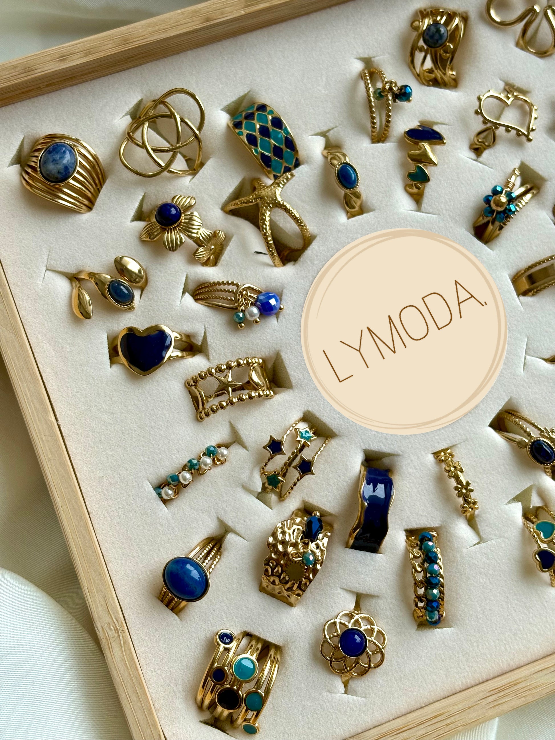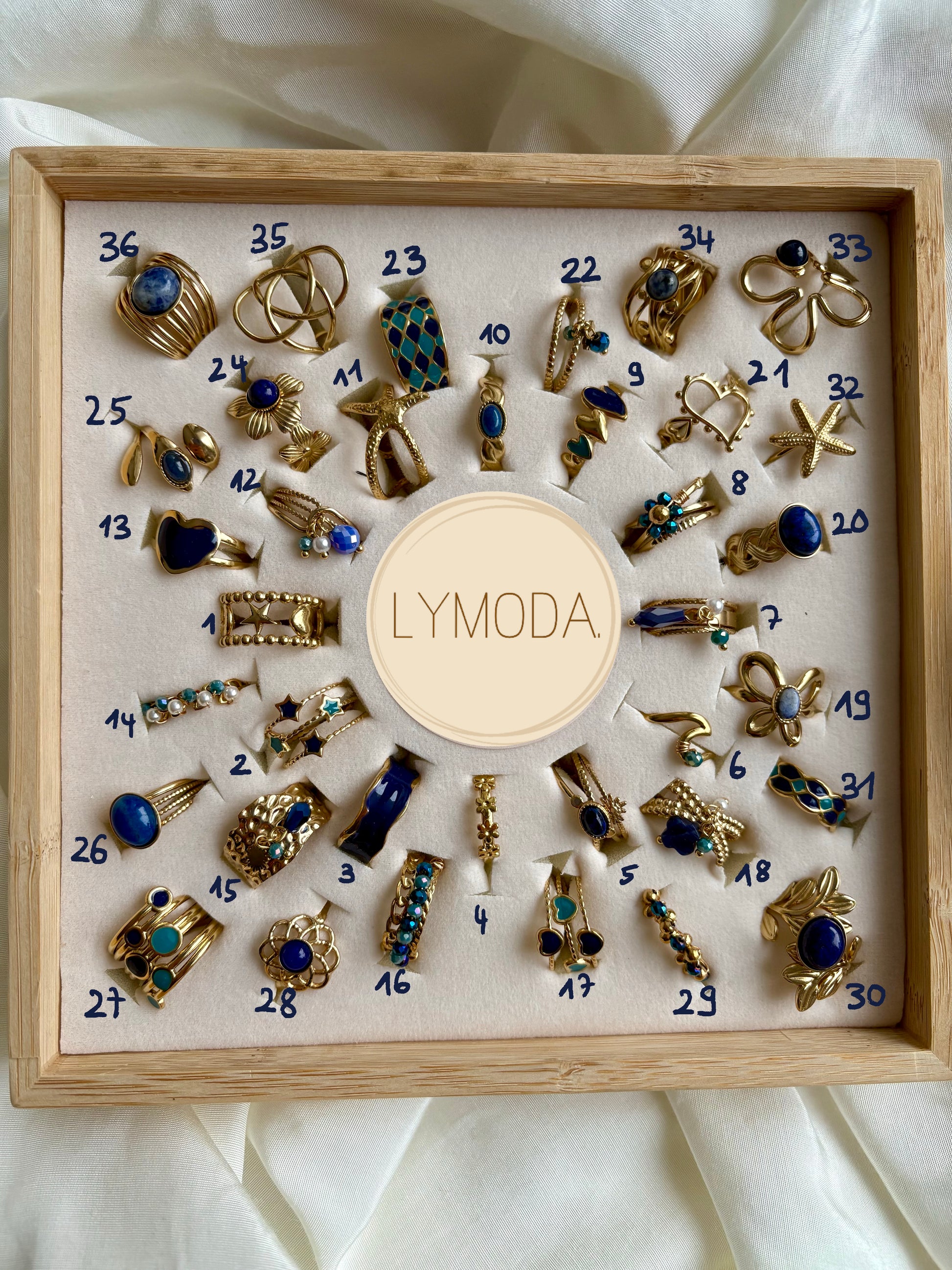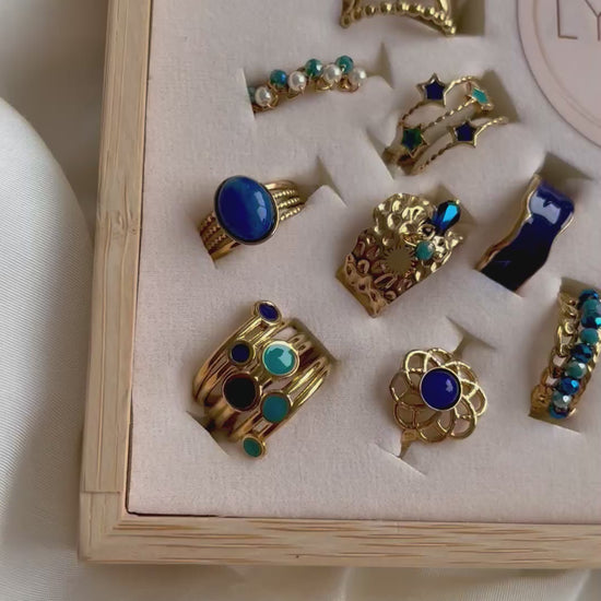 Jeder dieser 36 wunderschönen Goldringe ist ein Unikat mit eleganten blauen Akzenten, die das klassische Gold perfekt ergänzen. 🌟