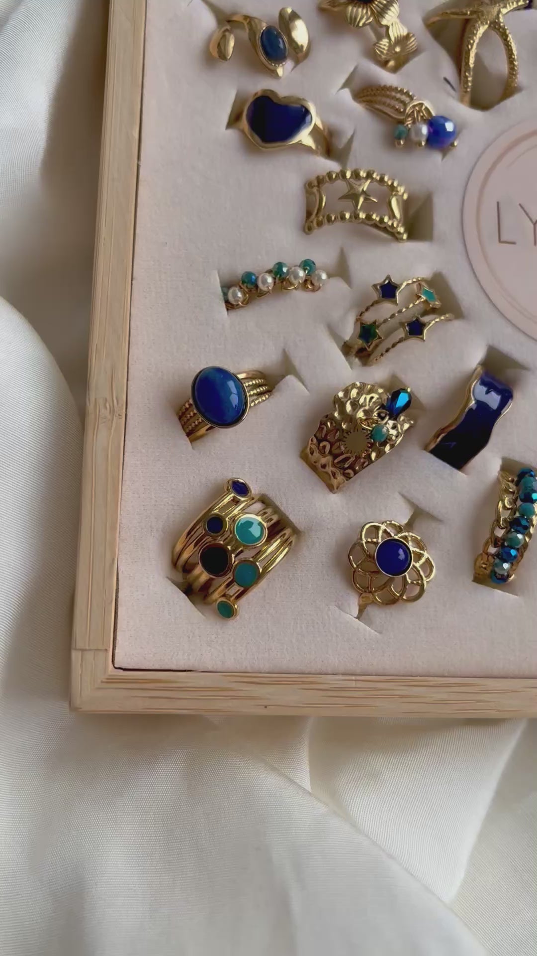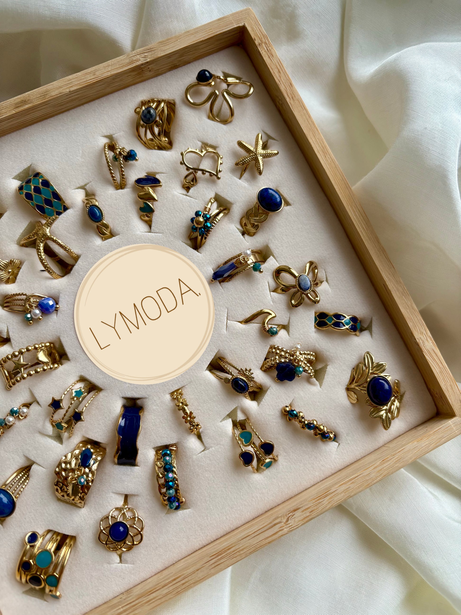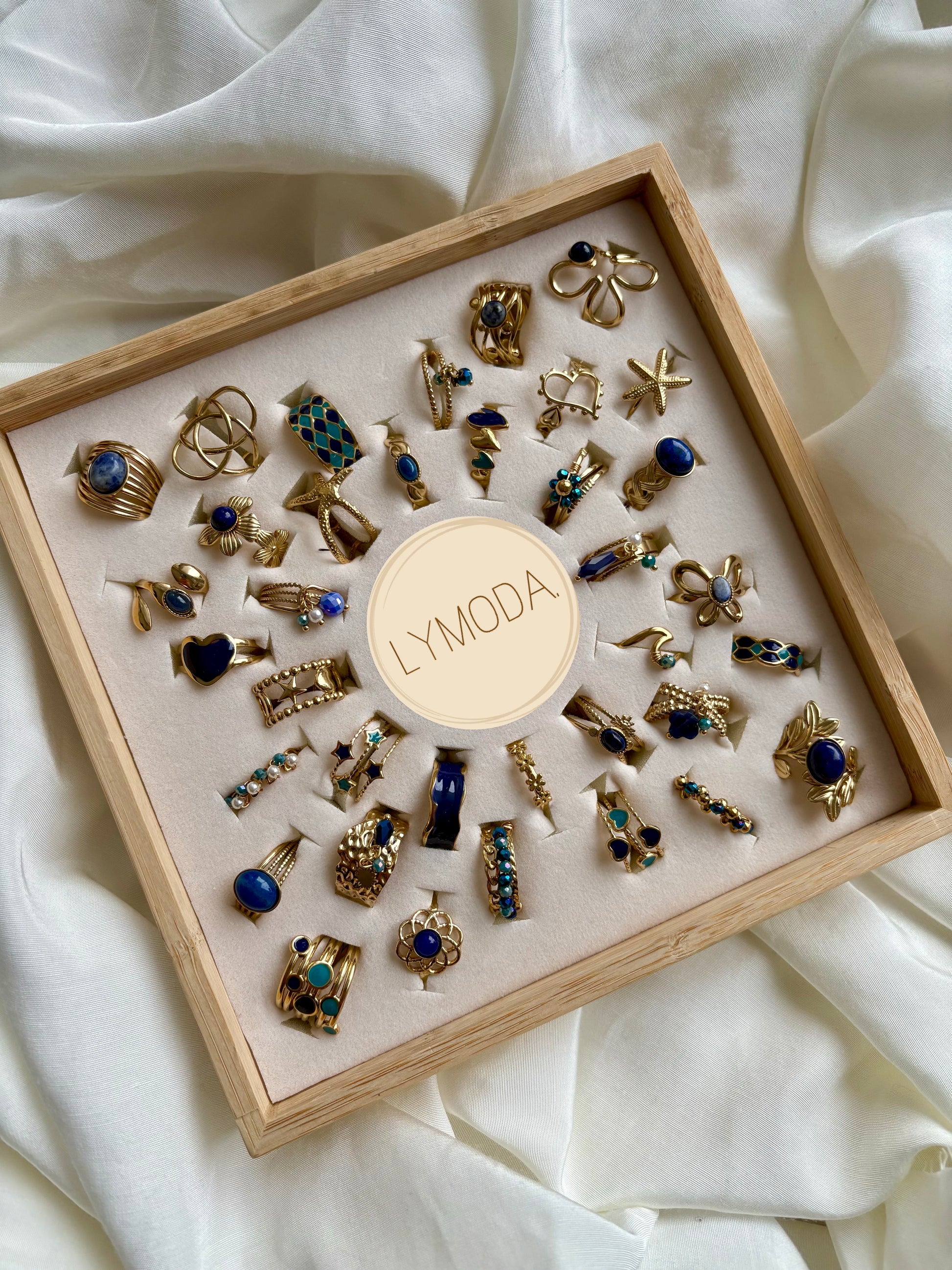 Jeder dieser 36 wunderschönen Goldringe ist ein Unikat mit eleganten blauen Akzenten, die das klassische Gold perfekt ergänzen. 🌟