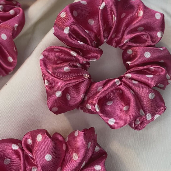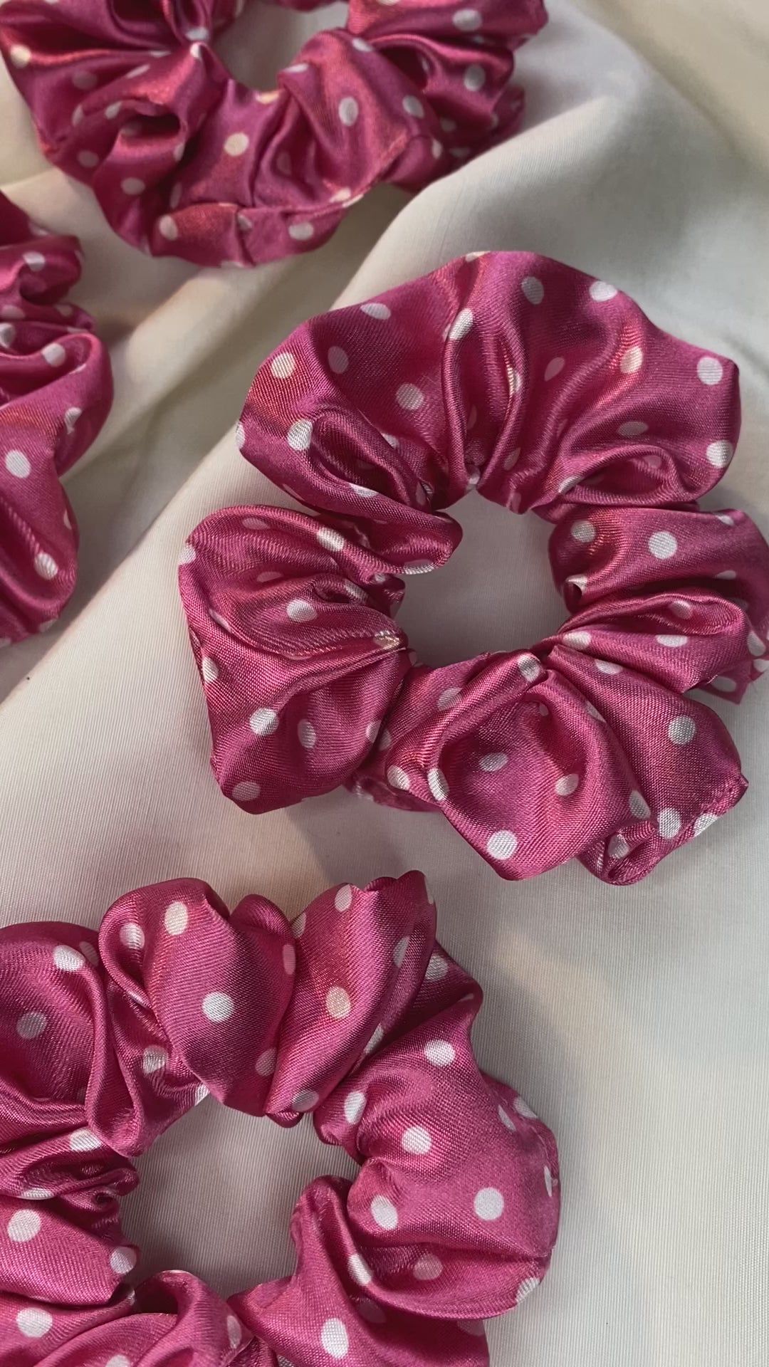 Hier seht ihr mein handgemachtes Scrunchie in Pink Satin mit weißen Punkten. Das Scrunchie findet ihr in zwei verschiedenen Größen. Der Stoff ist wirklich super super weich, und somit sehr schonend für die Haare.