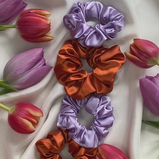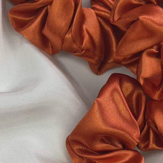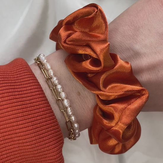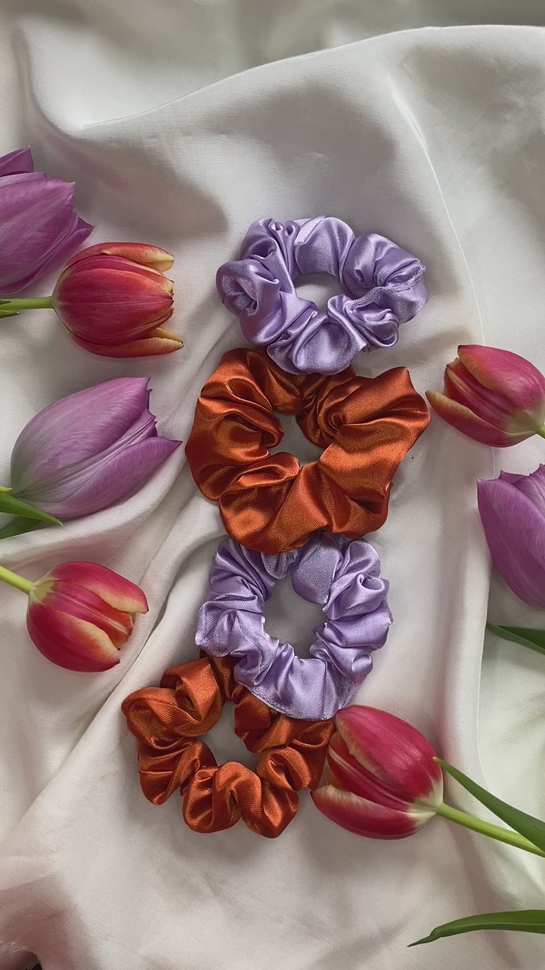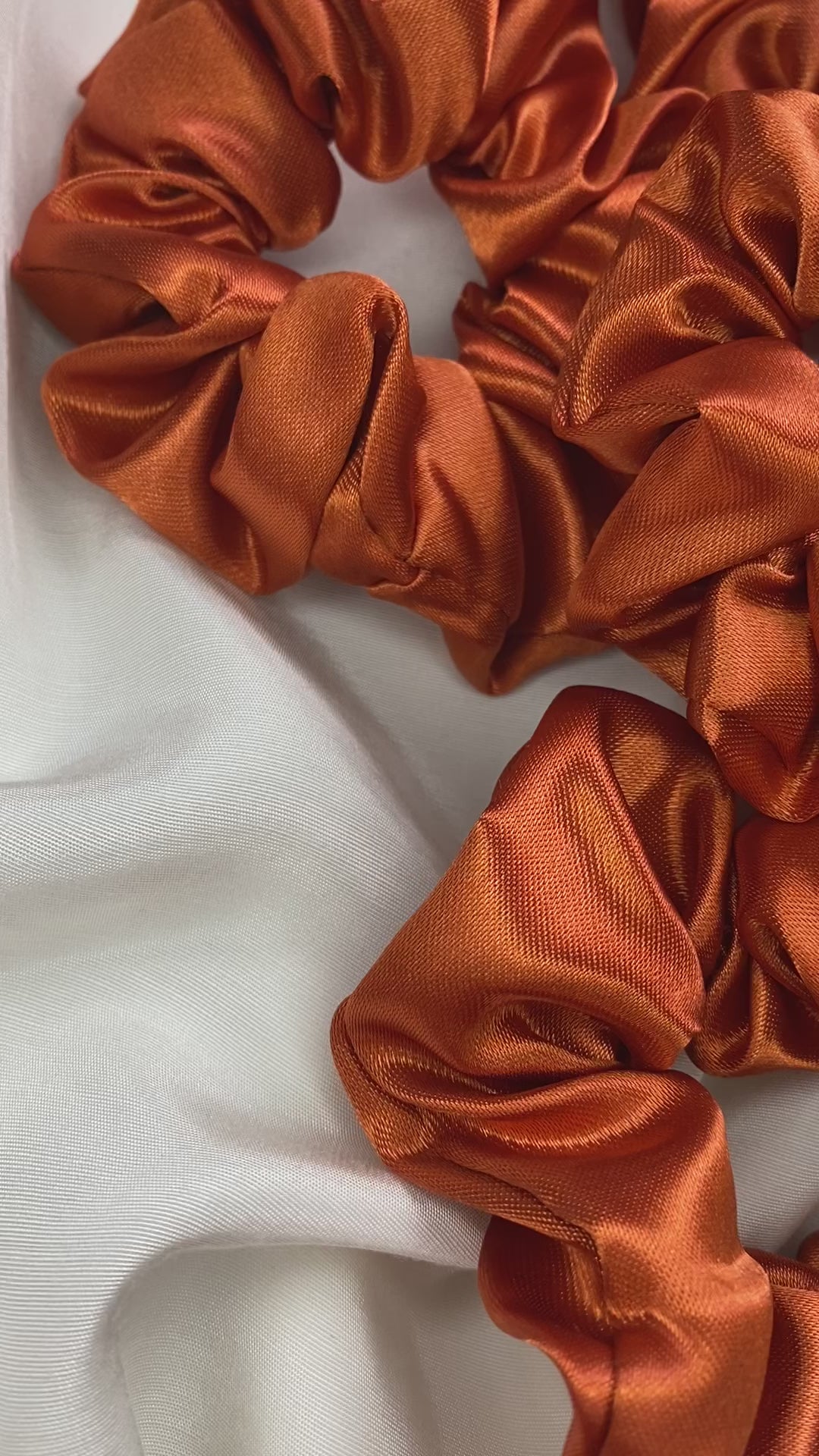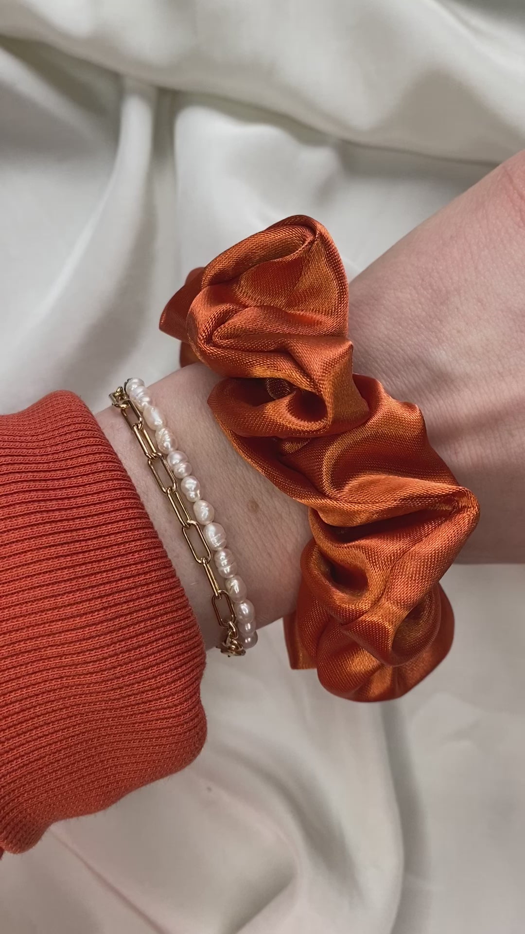 Hier seht ihr mein handgemachtes Scrunchie in Satin Orange. Das Scrunchie findet ihr in zwei verschiedenen Größen. Der Stoff ist wirklich super super weich, und somit sehr schonend für die Haare.