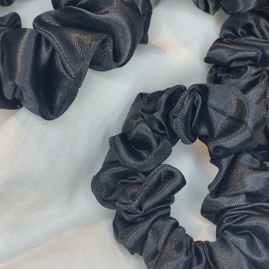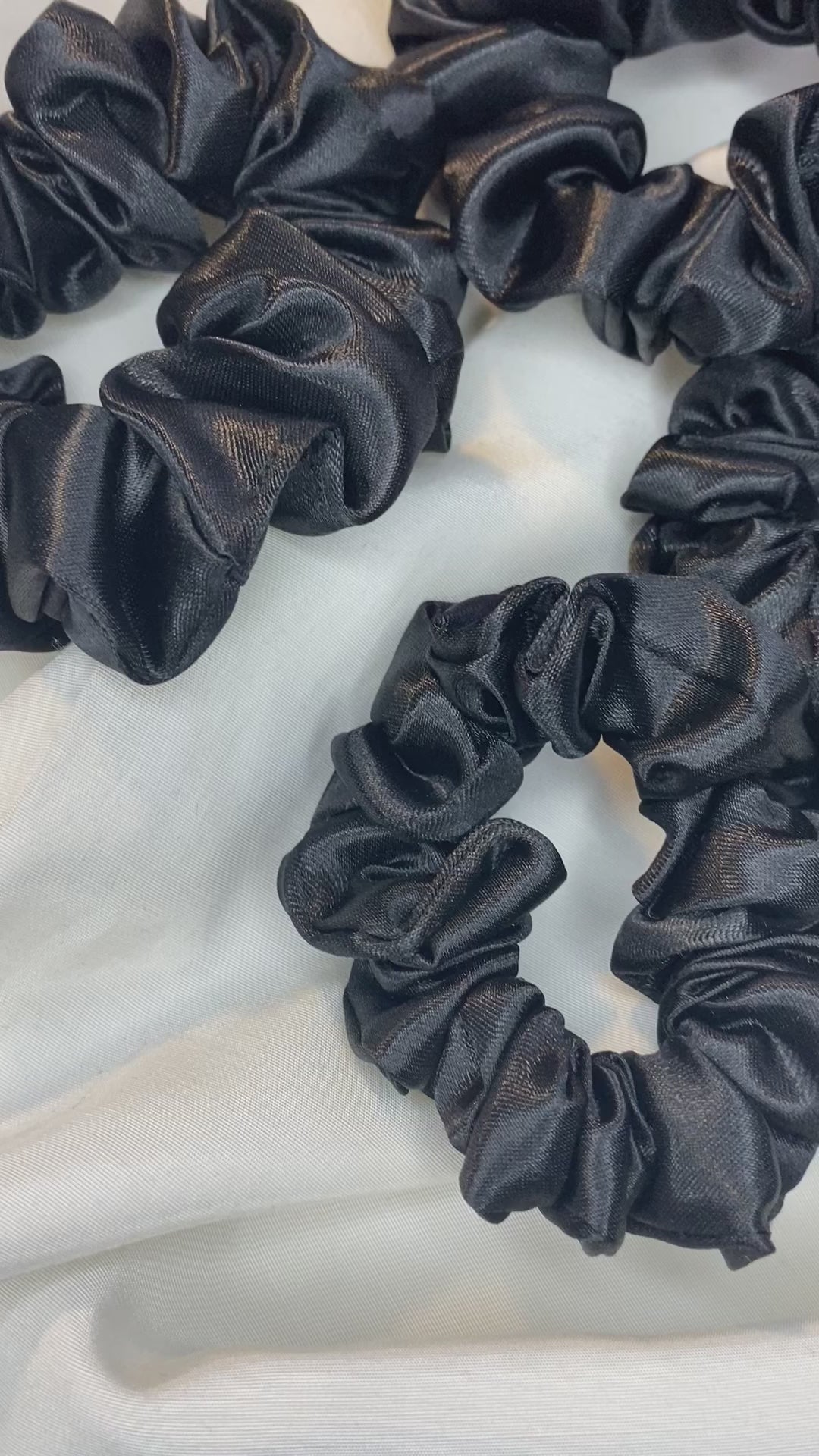 Hier seht ihr mein handgemachtes Scrunchie in Satin Schwarz. Das Scrunchie findet ihr in zwei verschiedenen Größen. Der Stoff ist wirklich super super weich, und somit sehr schonend für die Haare.