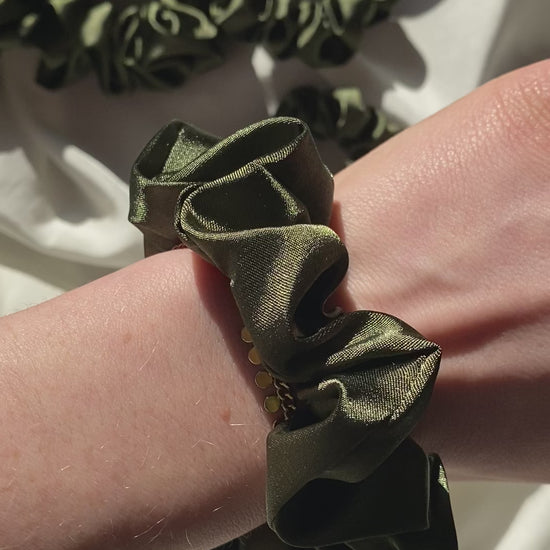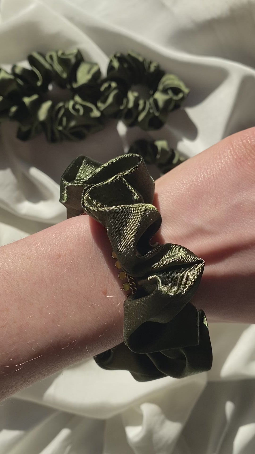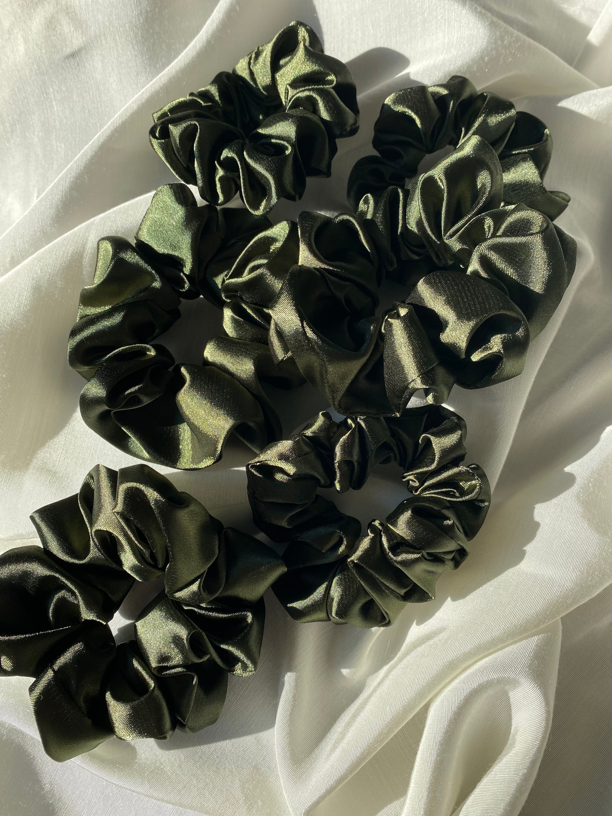 Hier seht ihr mein handgemachtes Scrunchie in Dunkelgrün aus Satin. Das Scrunchie findet ihr in zwei verschiedenen Größen. Der Stoff ist wirklich super super weich, und somit sehr schonend für die Haare.