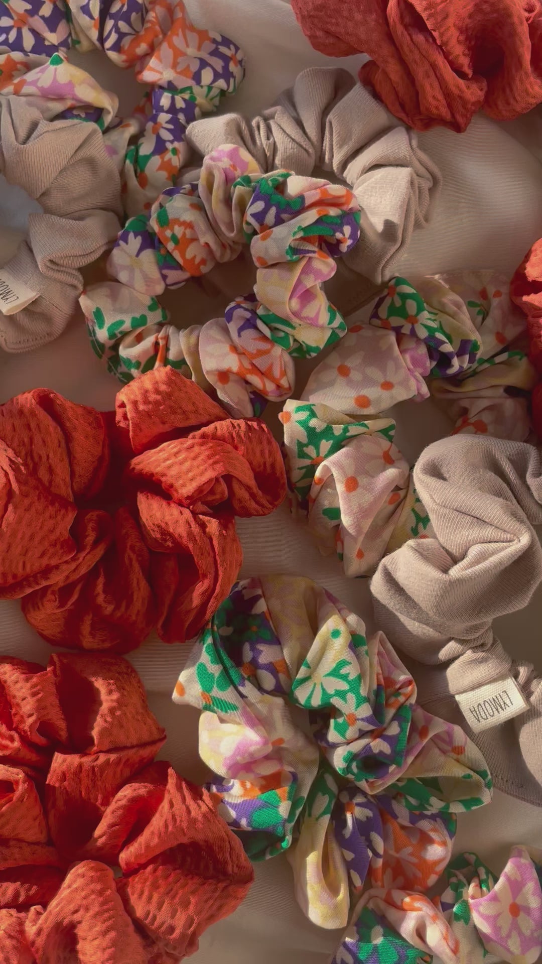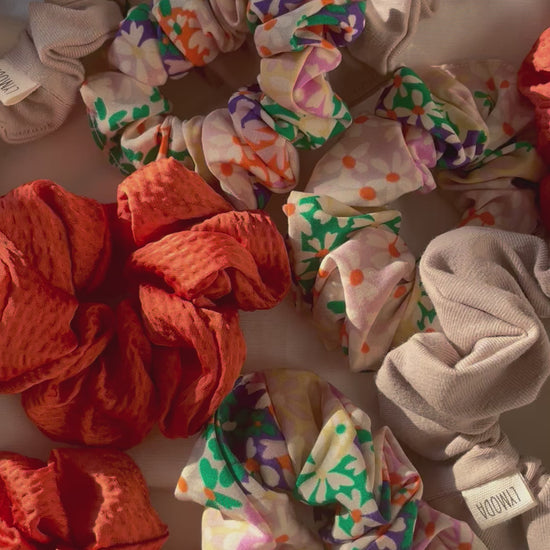 Hier seht ihr mein handgemachten Scrunchies in wunderschönen Frühlingsmustern. Jedes Scrunchie findet ihr in zwei verschiedenen Größen. Die Stoffe sind wirklich super super weich. Das Beige Scrunchie ist aus Jersey und super schönend für die Haare. Der orangene Stoff ist ein Satin Stoff, auch sehr schonend für die Haare. Der Blumenstoff ist ein Baumwollstoff, welcher er für den festeren Halt geeignet ist und besonders gut für raueres Haar geeignet ist.