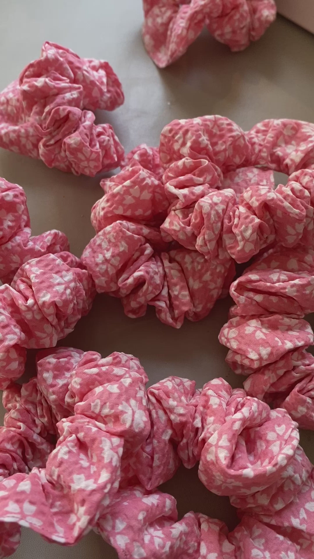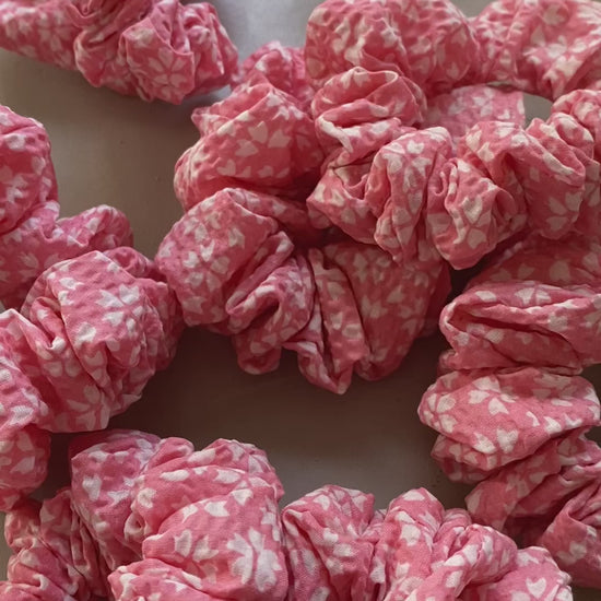 Hier seht ihr mein handgemachtes Scrunchie in Rosa seesucker Baumwolle mit weißem Muster. Das Scrunchie findet ihr in zwei verschiedenen Größen. Der Stoff ist wirklich super super weich, und somit sehr schonend für die Haare.