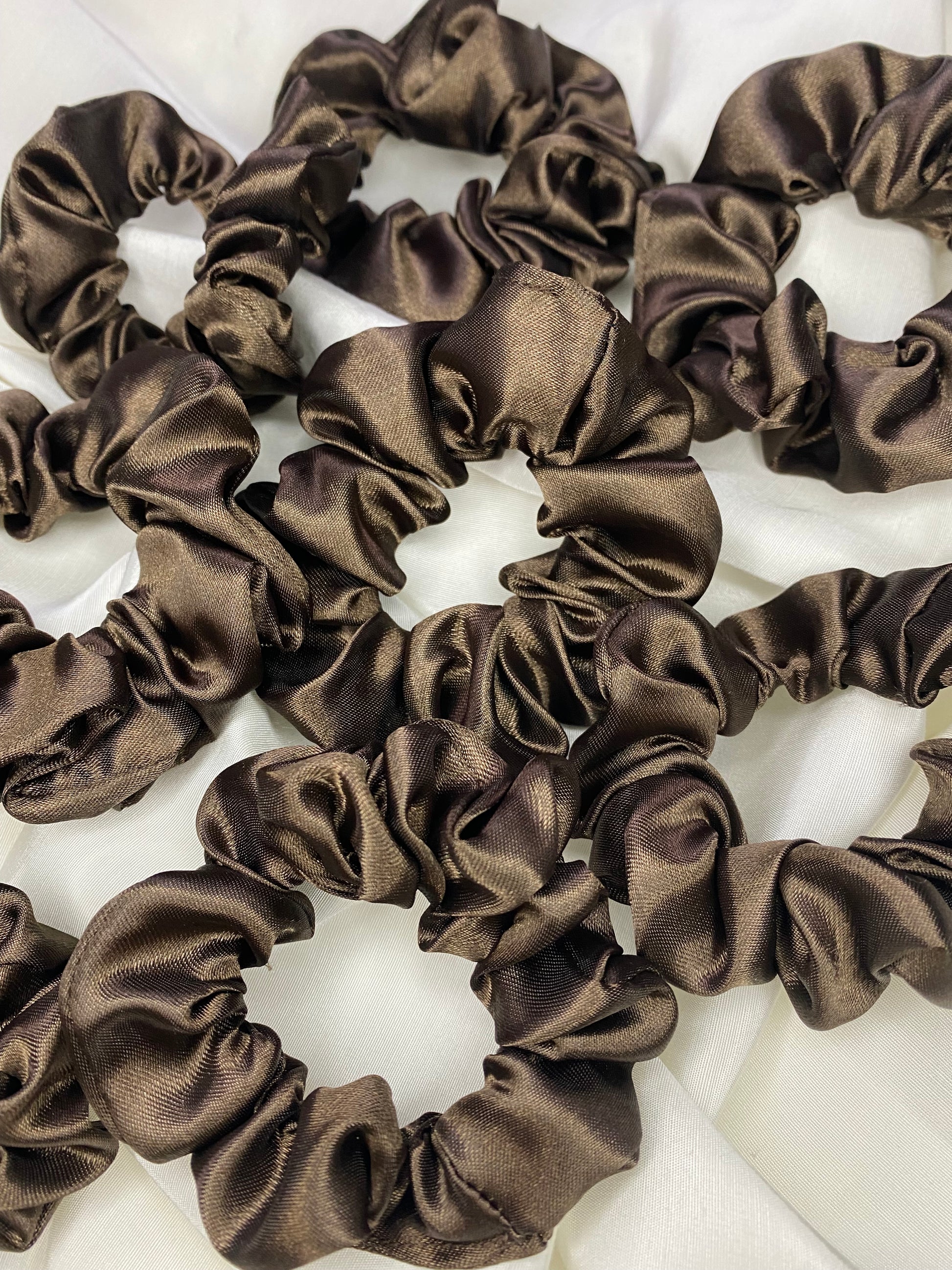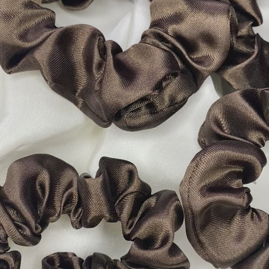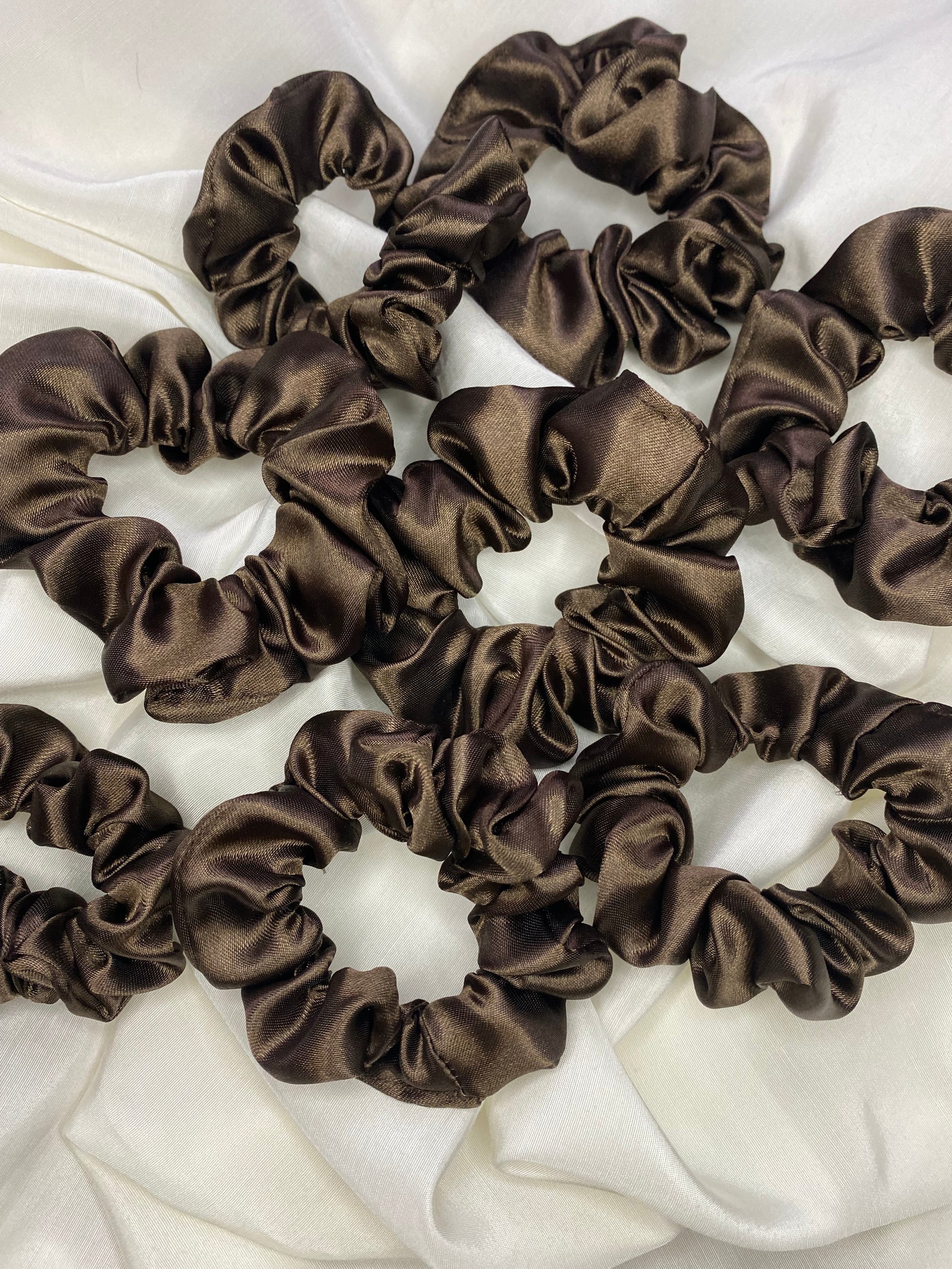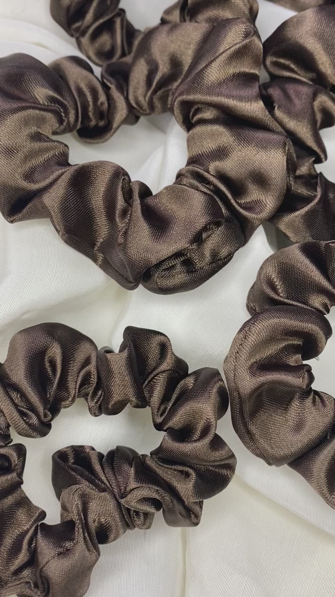 Hier seht ihr mein handgemachtes Scrunchie in Satin Dunkelbraun. Das Scrunchie findet ihr in zwei verschiedenen Größen. Der Stoff ist wirklich super super weich, und somit sehr schonend für die Haare.