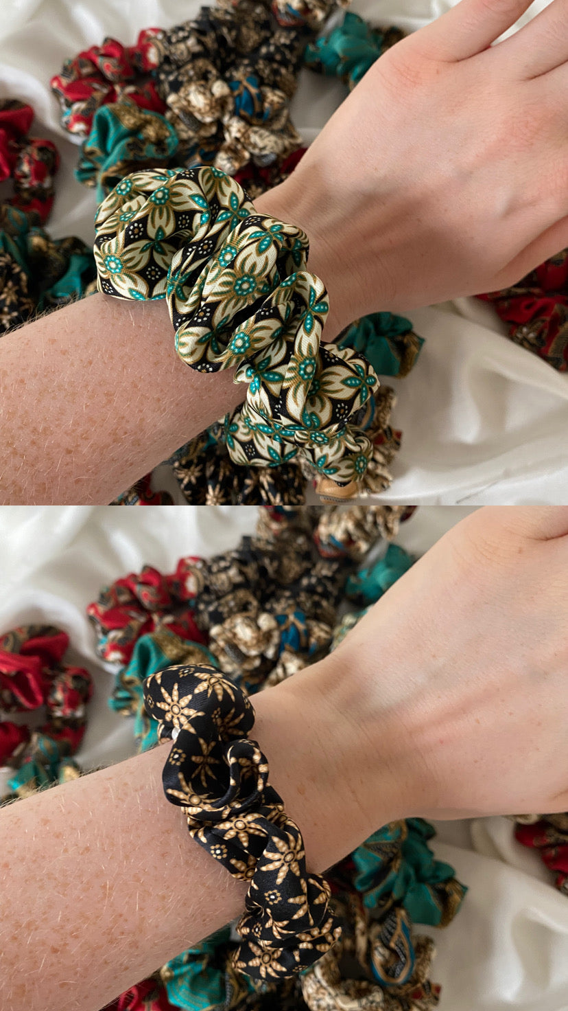 Hier seht ihr mein handgemachtes Scrunchie in einem schönen gemusterten Satin Stoff. Das Scrunchie findet ihr in zwei verschiedenen Größen. Der Stoff ist wirklich super super weich, und somit sehr schonend für die Haare.
