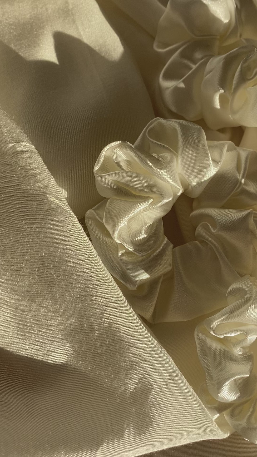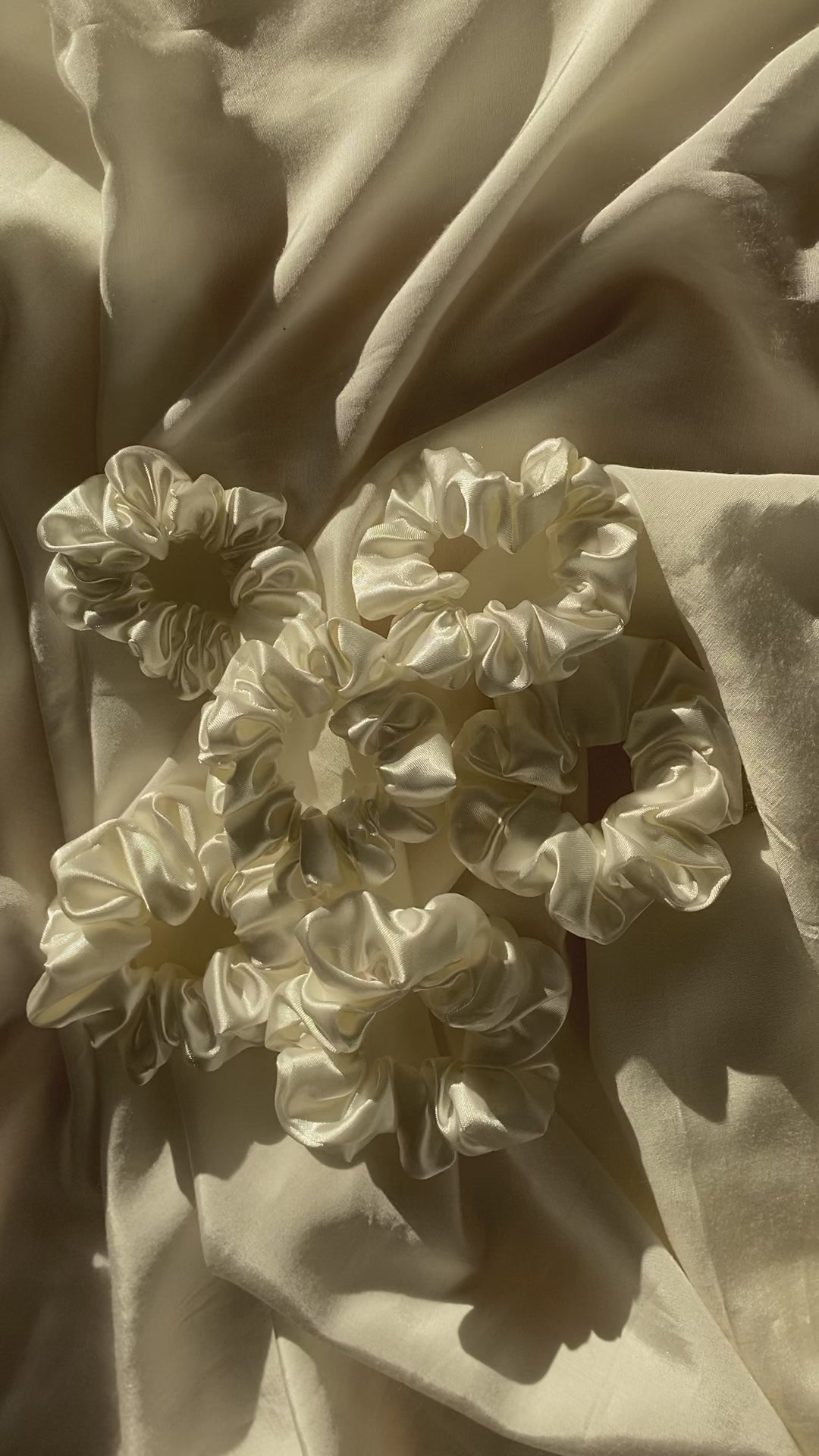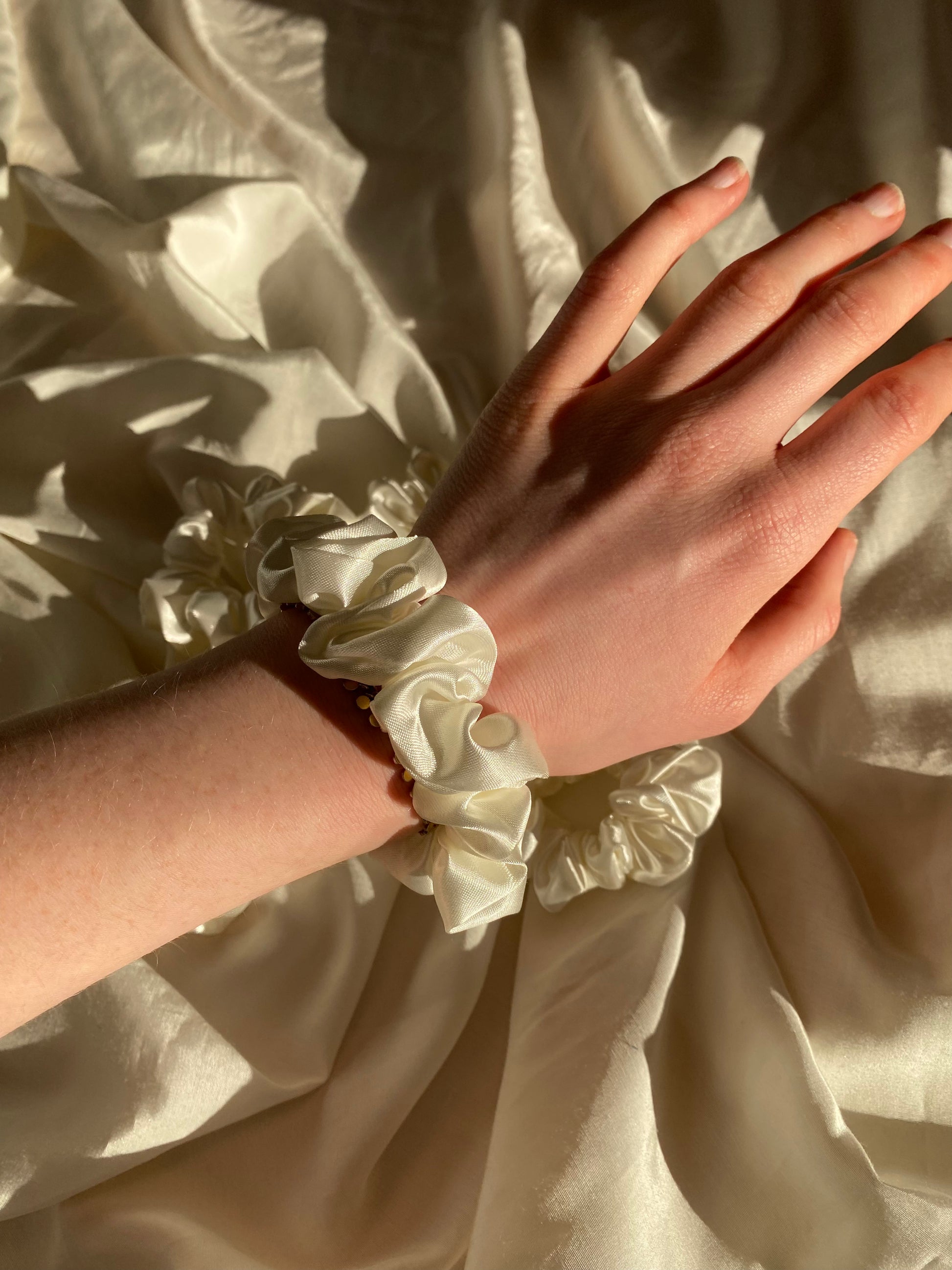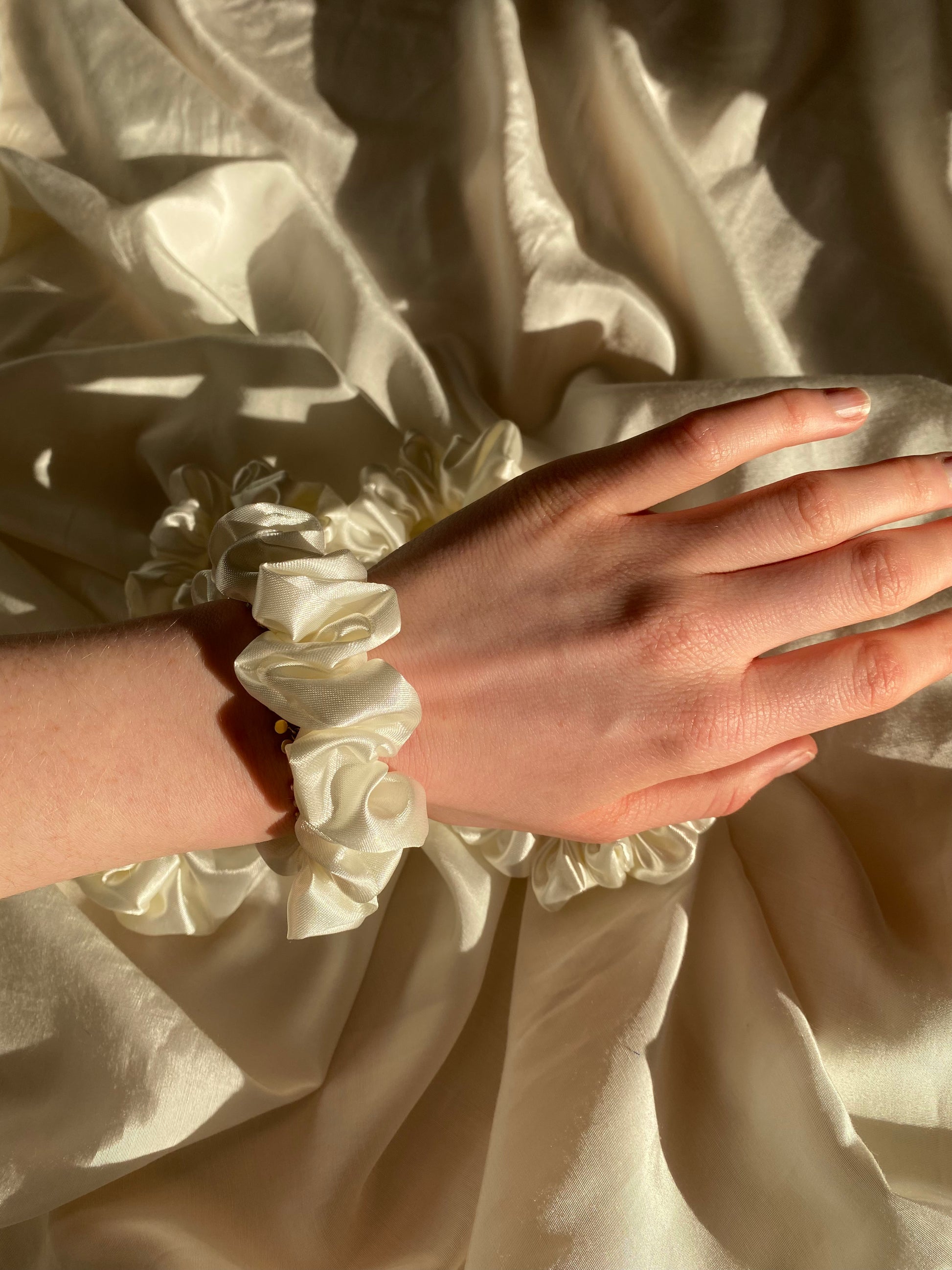 Hier seht ihr mein handgemachtes Scrunchie in Weiß aus Satin. Das Scrunchie findet ihr in zwei verschiedenen Größen. Der Stoff ist wirklich super super weich, und somit sehr schonend für die Haare.